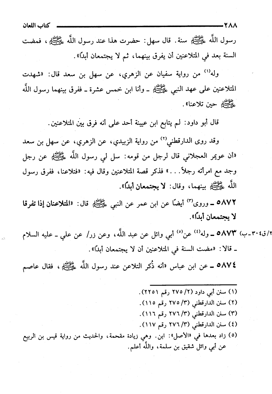 5872 - وروى (¬3) أيضًا عن ابن عمر عن النبي - صلى الله عليه وسلم - قال: "المتلاعنان إذا تفرقا لا يجتمعان أبداً".