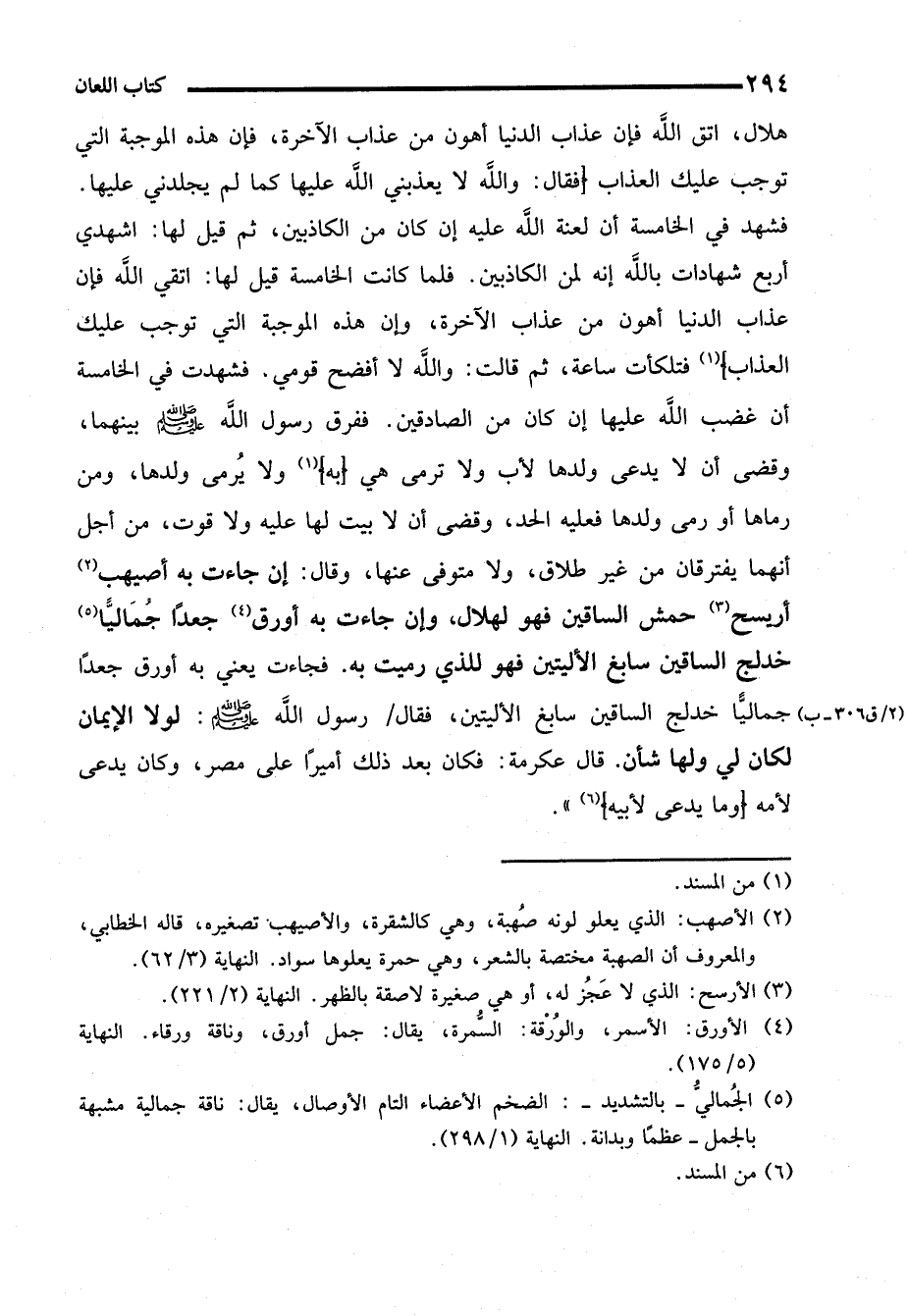 هلال، اتق الله فإن عذاب الدنيا أهون من عذاب الآخرة، فإن هذه الموجبة التي توجب عليك العذاب (فقال: والله لا يعذبني الله عليها كما لم يجلدني عليها. فشهد في الخامسة أن لعنة الله عليه إن كان من الكاذبين، ثم قيل لها: اشهدي أربع شهادات بالله إنه لمن الكاذبين. فلما كانت الخامسة قيل لها: اتقي الله فإن عذاب الدنيا أهون من عذاب الآخرة، وإن هذه الموجبة التي توجب عليك العذاب) (¬1) فتلكأت ساعة، ثم قالت: واللَّه لا أفضح قومي. فشهدت في الخامسة أن غضب الله عليها إن كان من الصادقين. ففرق رسول الله - صلى الله عليه وسلم - بينهما، وقضى أن لا يدعى ولدها لأب ولا ترمى هي (به) (1) ولا يُرمى ولدها، ومن رماها أو رمى ولدها فعليه الحد، وقضى أن لا بيت لها عليه ولا قوت، من أجل أنهما يفترقان من غير طلاق، ولا متوفى عنها، وقال: إن جاءت به أصيهب (¬2) أريسح (¬3) حمش الساقين فهو لهلال، وإن جاءت به أورق (¬4) جعدًا جُمَاليًّا (¬5) خدلج الساقين سابغ الأليتين فهو للذي رميت به. فجاءت يعني به أورق جعدًا جماليًّا خدلج الساقين سابغ الأليتين، فقال رسول الله - صلى الله عليه وسلم -: لولا الإيمان لكان لي ولها شأن. قال عكرمة: فكان بعد ذلك أميرًا على مصر، وكان يدعى لأمه (وما يدعى لأبيه) (¬6) ".