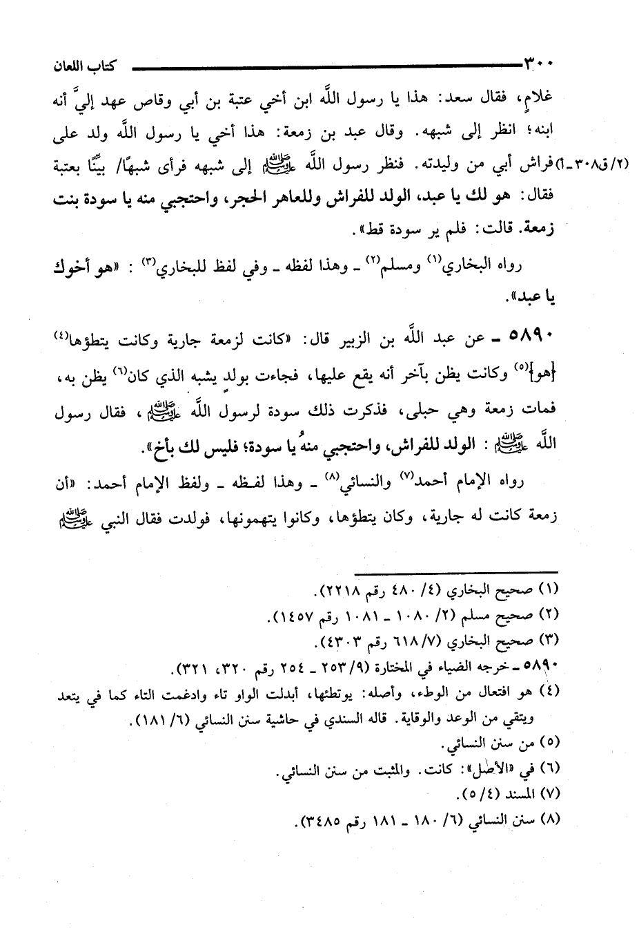 5890 - عن عبد الله بن الزبير قال: "كانت لزمعة جارية وكانت يتطؤها (¬4) (هو) (¬5) وكانت يظن بآخر أنه يقع عليها، فجاءت بولد يشبه الذي كان (¬6) يظن به، فمات زمعة وهي حبلى، فذكرت ذلك سودة لرسول الله - صلى الله عليه وسلم -، فقال رسول الله - صلى الله عليه وسلم -: الولد للفراش، واحتجبي منهُ يا سودة؛ فليس لك بأخ".