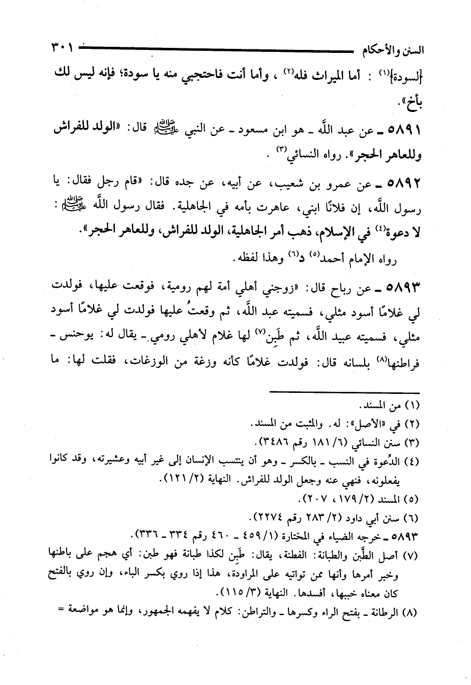 5891 - عن عبد الله -هو ابن مسعود- عن النبي - صلى الله عليه وسلم - قال: "الولد للفراش وللعاهر الحجر". رواه النسائي (¬3).