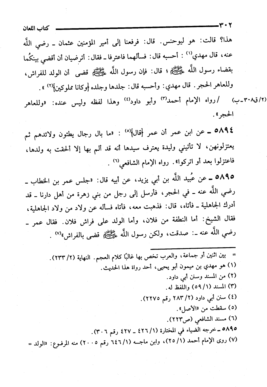 5895 - عن عُبيد الله بن أبي يزيد، عن أبيه قال: "جلس عمر بن الخطاب -رضي الله عنه- في الحجر، فأرسل إلى رجل من بني زهرة من أهل دارنا -قد أدرك الجاهلية- فأتاه، قال: فذهبت معه، فأتاه فسأله عن ولاد من ولاد الجاهلية، فقال الشيخ: أما النطفة من فلان، وأما الولد على فراش فلان. فقال عمر -رضي الله عنه-: صدقت، ولكن رسول الله - صلى الله عليه وسلم - قضى بالفراش" (¬7).