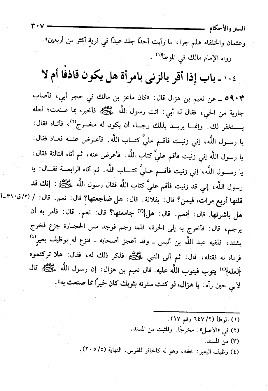 5903 - عن نعيم بن هزال قال: "كان ماعز بن مالك في حجر أبي، فأصاب جارية من الحي، فقال له أبي: ائت رسول الله - صلى الله عليه وسلم - فأخبره بما صنعت؛ لعله يستغفر لك. وإنما يريد بذلك رجاء أن يكون له مخرج (¬2)، فأتاه فقال: يا رسول الله، إني زنيت فأقم عليَّ كتاب الله. فأعرض عنه فعاد فقال: يا رسول الله إني زنيت فأقم عليَّ كتاب الله. فأعرض عنه، ثم أتاه الثالثة فقال: يا رسول الله، إني زنيت فأقم عليَّ كتاب الله. ثم أتاه الرابعة فقال: يا رسول الله، إني قد زنيت فأقم عليَّ كتاب الله فقال رسول الله - صلى الله عليه وسلم -: إنك قد قلتها أربع مرات، فيمن؟ قال: بفلانة. قال: هل ضاجعتها؟ قال: نعم. قال: هل باشرتها. قال: (نعم. قال: هل) (¬3) جامعتها؟ قال: نعم. قال: فأمر به أن يرجم، قال: فأخرج به إلى الحرة، فلما رجم فوجد مس الحجارة جزع فخرج يشتد، فلقيه عبد الله بن أنيس -وقد أعجز أصحابه- فنزع له بوظيف بعيرٍ (¬4) فرماه به فقتله، قال: ثم أتى النبي - صلى الله عليه وسلم - فذكر ذلك له، فقال: هلا تركتموه (لعله) (4) يتوب فيتوب الله عليه. قال نعيم بن هزال: إن رسول الله - صلى الله عليه وسلم - قال لأبي حين رآه: يا هزال، لو كنت سترته بثوبك كان خيراً مما صنعت به".