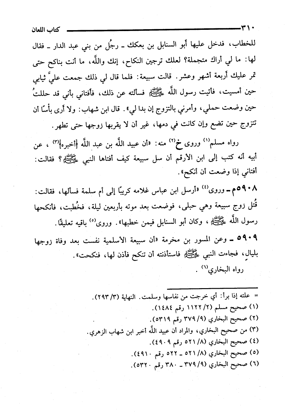 للخطاب، فدخل عليها أَبو السنابل بن بعكك -رجُل من بني عبد الدار- فقال لها: ما لي أراك متجملة؟ لعلك ترجين النكاح، إنك والله، ما أنت بناكح حتى تمر عليك أربعة أشهر وعشر. قالت سبيعة: فلما قال لي ذلك جمعت عليَّ ثيابي حين أمسيت، فأتيت رسول الله - صلى الله عليه وسلم - فسألته عن ذلك، فأَفتاني بأني قد حللتُ حين وضعت حملي، وأمرني بالتزوج إن بدا لي". قال ابن شهاب: ولا أرى بأسًا أن تتزوج حين تضع وإن كانت في دمها، غير أن لا يقربها زوجها حتى تطهر.