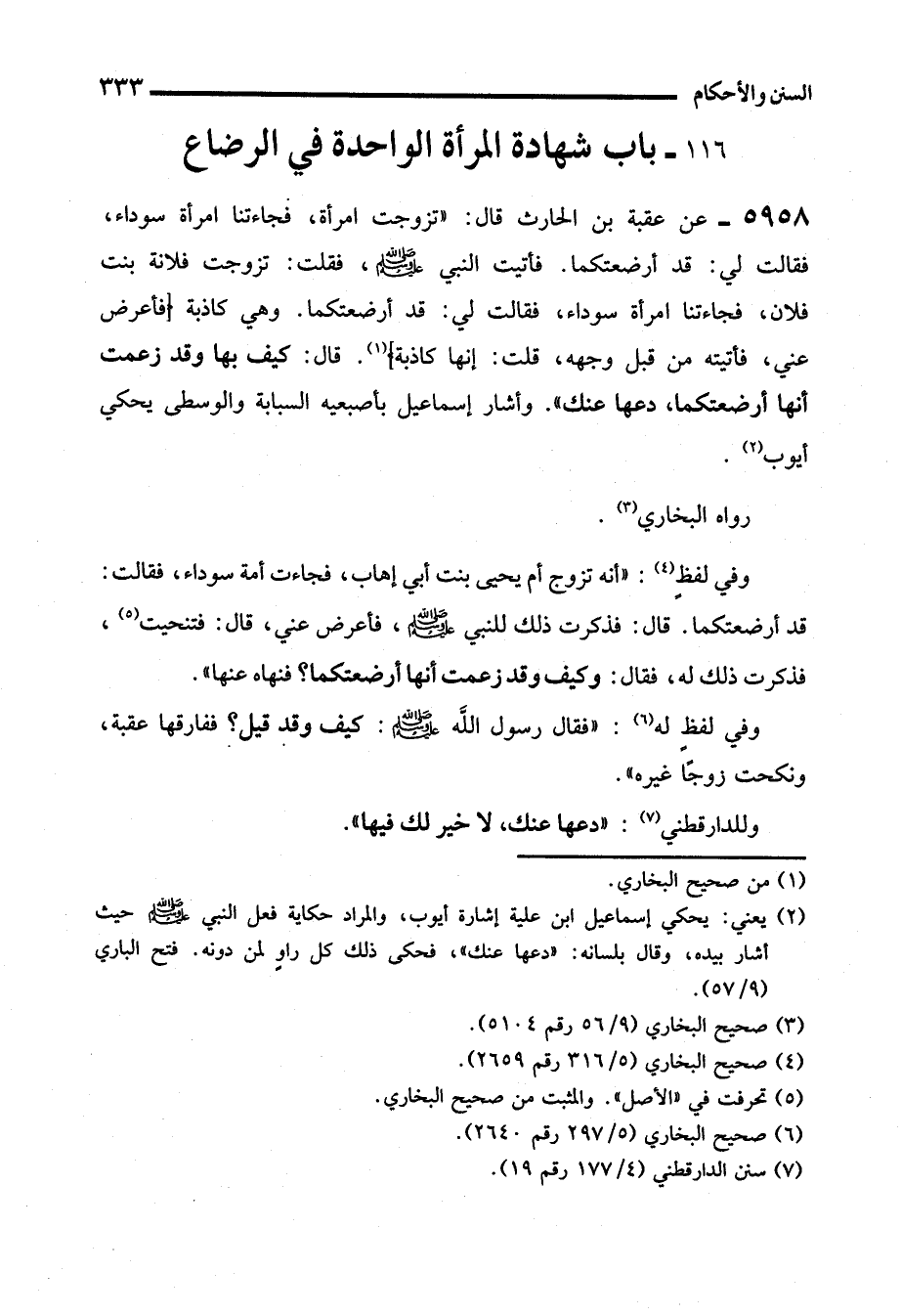 5958 - عن عقبة بن الحارث قال: "تزوجت امرأة، فجاءتنا امرأة سوداء، فقالت لي: قد أرضعتكما. فأتيت النبي - صلى الله عليه وسلم -، فقلت: تزوجت فلانة بنت فلان، فجاءتنا امرأة سوداء، فقالت لي: قد أرضعتكما. وهي كاذبة (فأعرض عني، فأتيته من قبل وجهه، قلت: إنها كاذبة) (¬1). قال: كيف بها وقد زعمت أنها أرضعتكما، دعها عنك". وأشار إسماعيل بأصبعيه السبابة والوسطى يحكي أيوب (¬2).