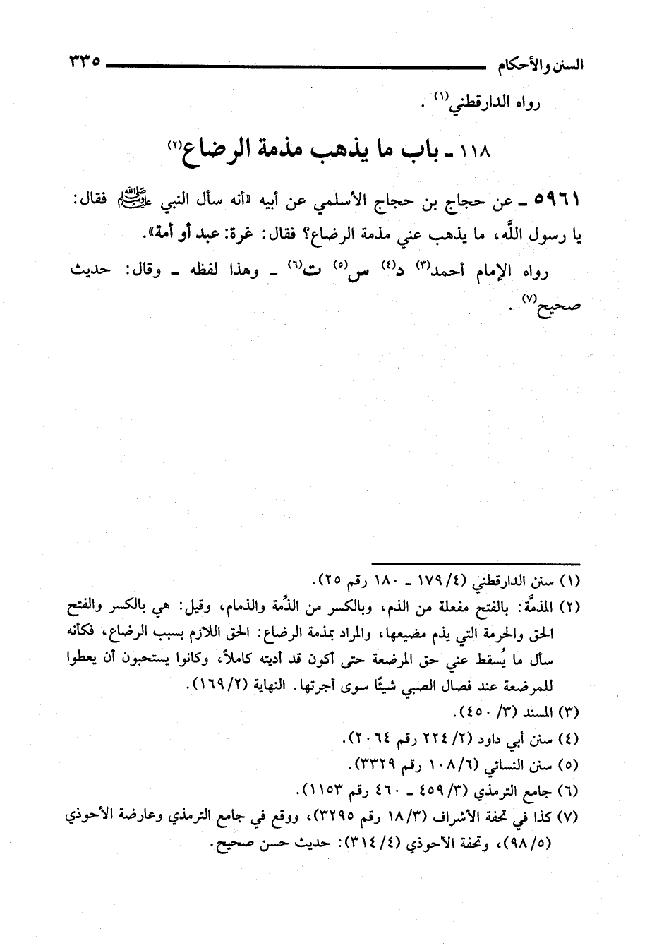 5961 - عن حجاج بن حجاج الأسلمي عن أبيه "أنه سأل النبي - صلى الله عليه وسلم -، فقال: يا رسول الله، ما يذهب عني مذمة الرضاع؟ فقال: غرة: عبد أو أمه".