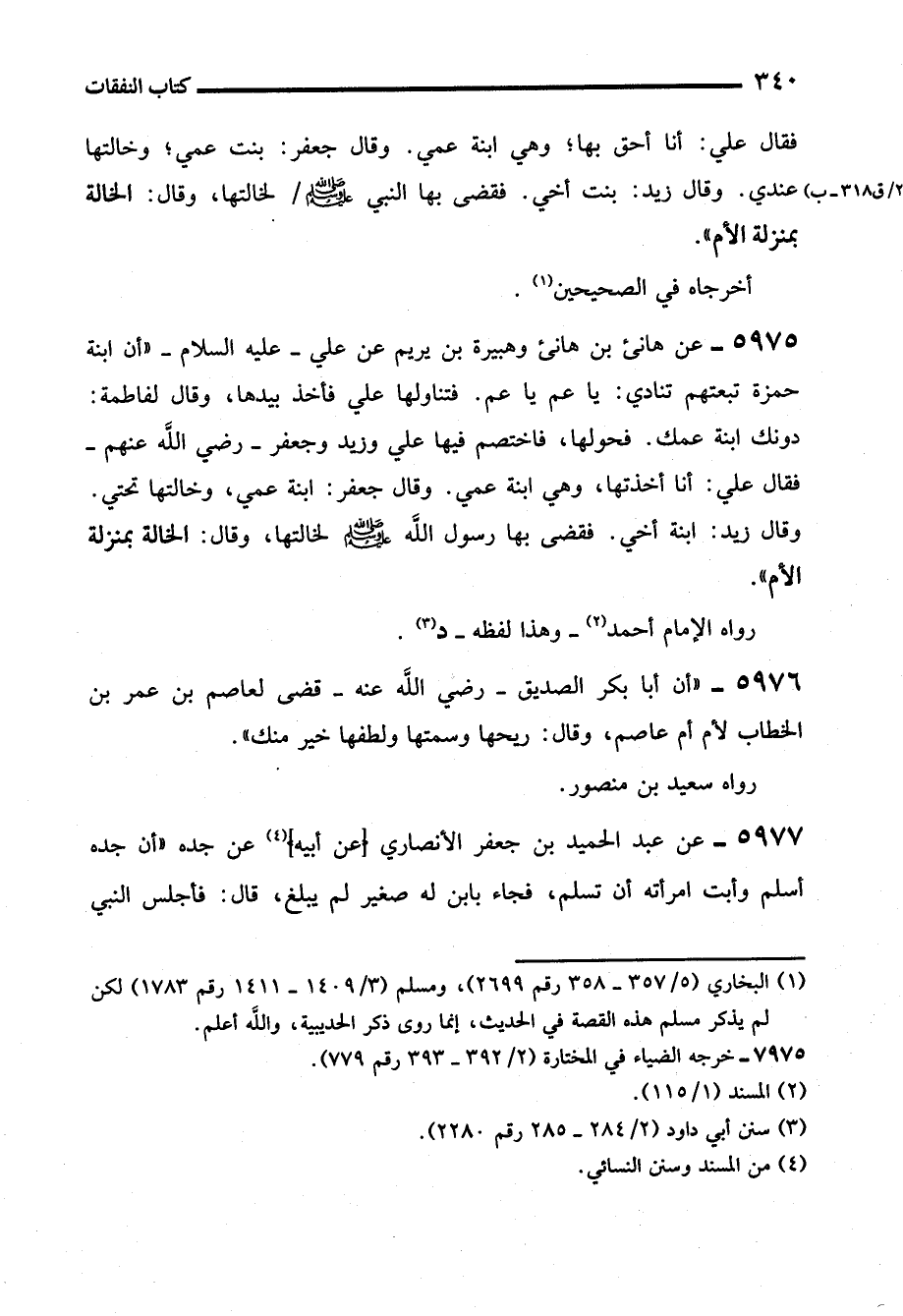 5975 - عن هانئ بن هانئ وهبيرة بن يريم عن علي -رضي الله عنه- "أن ابنة حمزة تبعتهم تنادي: يا عم يا عم. فتناولها علي فأخذ بيدها، وقال لفاطمة: دونك ابنة عمك. فحولها، فاختصم فيها علي وزيد وجعفر -رضي الله عنهم- فقال علي: أنا أخذتها، وهي ابنة عمي. وقال جعفر: ابنة عمي، وخالتها تحتي. وقال زيد: ابنة أخي. فقضى بها رسول الله - صلى الله عليه وسلم - لخالتها، وقال: الخالة بمنزلة الأم".