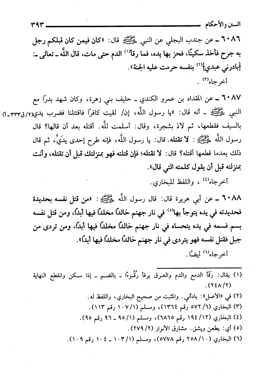 6086 - عن جندب البجلي عن النبي - صلى الله عليه وسلم - قال: "كان فيمن كان قبلكم رجل به جرح فأخذ سكينًا، فحز بها يده، فما رقأ (¬1) الدم حتى مات، قال الله -تعالى-: (بادرني عبدي) (¬2) بنفسه حرمت عليه الجنة".