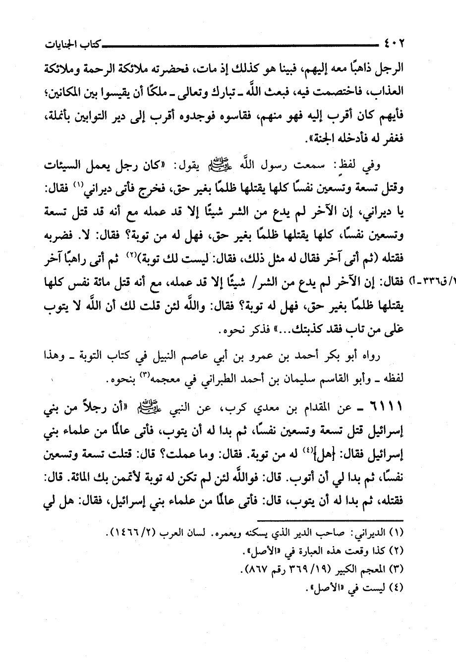 6111 - عن المقدام بن معدي كرب، عن النبي - صلى الله عليه وسلم - "أن رجلاً من بني إسرائيل قتل تسعة وتسعين نفسًا، ثم بدا له أن يتوب، فأتى عالماً من علماء بني إسرائيل فقال: (هل) (¬4) له من توبة. فقال: وما عملت؟ قال: قتلت تسعة وتسعين نفسًا، ثم بدا لي أن أتوب. قال: فوالله لئن لم تكن له توبة لأتممن بك المائة. قال: فقتله، ثم بدا له أن يتوب، قال: فأتى عالماً من علماء بني إسرائيل، فقال: هل لي