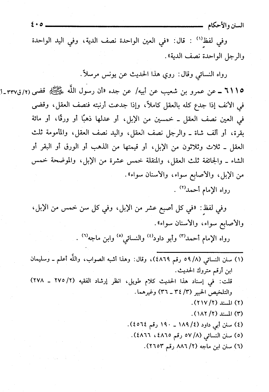 6115 - عن عمرو بن شعيب عن أبيه عن جده "أن رسول الله - صلى الله عليه وسلم - قضى في الأنف إذا جدع كله بالعقل كاملاً، وإذا جدعت أرنبته فنصف العقل، وقضى في العين نصف العقل -خمسين من الإبل، أو عدلها ذهبًا أو ورقًا، أو مائة بقرة، أو ألف شاة- والرجل نصف العقل، واليد نصف العقل، والمأمومة ثلث العقل -ثلاث وثلاثون من الإبل، أو قيمتها من الذهب أو الورق أو البقر أو الشاء- والجائفة ثلث العقل، والمنقلة خمس عشرة من الإبل، والموضحة خمس من الإبل، والأصابع سواء، والأسنان سواء".
