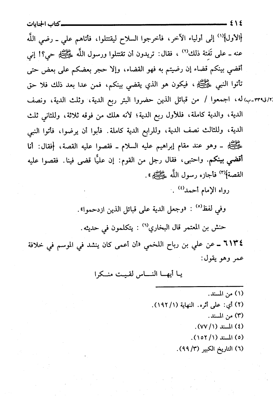 (الأول) (¬1) إلى أولياء الآخر، فأخرجوا السلاح ليقتتلوا، فأتاهم علي -رضي الله عنه- على تَفِئة ذلك (¬2)، فقال: تريدون أن تقتتلوا ورسول الله - صلى الله عليه وسلم - حي؟! إني أقضي بينكم قضاء إن رضيتم به فهو القضاء، وإلا حجر بعضكم على بعض تأتوا النبي - صلى الله عليه وسلم -، فيكون هو الذي يقضي بينكم، فمن عدا بعد ذلك فلا حق له، اجمعوا من قبائل الذين حضروا البئر ربع الدية، وثلث الدية، ونصف الدية، والدية كاملة، فللأول ربع الدية؛ لأنه هلك من فوقه ثلاثة، وللثاني ثلث الدية، وللثالث نصف الدية، وللرابع الدية كاملة. فأبوا أن يرضوا، فأتوا النبي - صلى الله عليه وسلم - وهو عند مقام إبراهيم عليه السلام- فقصوا عليه القصة، (فقال: أنا أقضي بينكم. واحتبى، فقال رجل من القوم: إن عليًّا قضى فينا. فقصوا عليه القصة) (¬3) فأجازه رسول الله - صلى الله عليه وسلم -".
