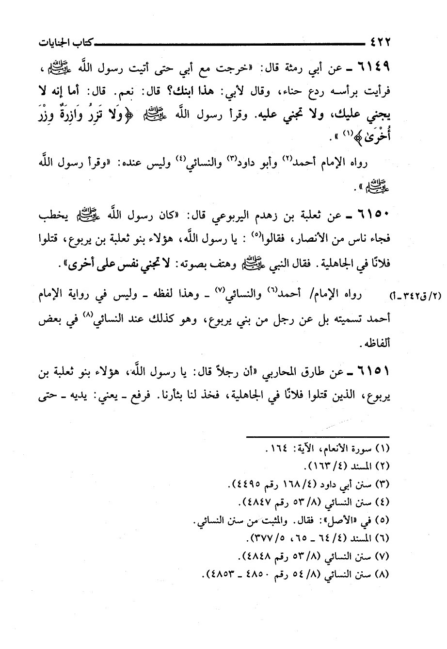 6150 - عن ثعلبة بن زهدم اليربوعي قال: "كان رسول الله - صلى الله عليه وسلم - يخطب فجاء ناس من الأنصار، فقالوا (¬5): يا رسول الله، هؤلاء بنو ثعلبة بن يربوع، قتلوا فلانًا في الجاهلية. فقال النبي - صلى الله عليه وسلم - وهتف بصوته: لا تجني نفس على أخرى".