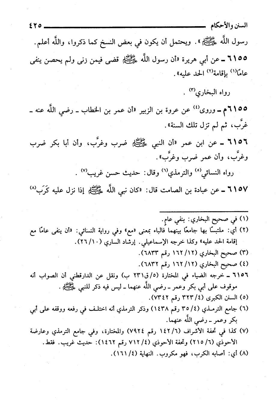 6155 - عن أبي هريرة "أن رسول الله - صلى الله عليه وسلم - قضى فيمن زنى ولم يحصن ينفى عامًا (¬1) بإقامة (¬2) الحد عليه".