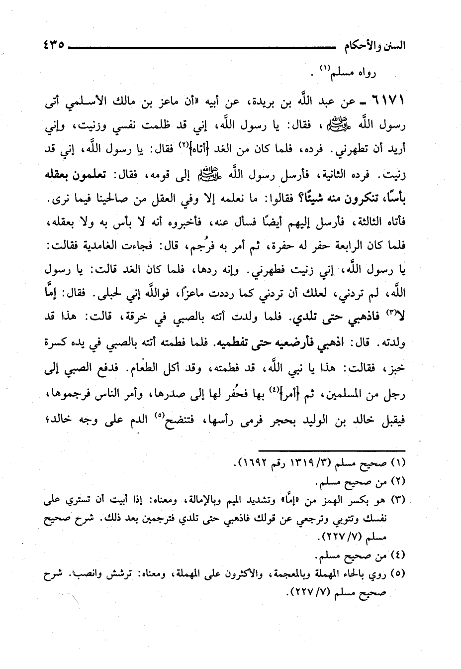 6171 - عن عبد الله بن بريدة، عن أبيه "أن ماعز بن مالك الأسلمي أتى رسول الله - صلى الله عليه وسلم -، فقال: يا رسول الله، إني قد ظلمت نفسي وزنيت، وإني أريد أن تطهرني. فرده، فلما كان من الغد (أتاه) (¬2) فقال: يا رسول الله، إني قد زنيت. فرده الثانية، فأرسل رسول الله - صلى الله عليه وسلم - إلى قومه، فقال: تعلمون بعقله بأساً، تنكرون منه شيئاً؟ فقالوا: ما نعلمه إلا وفي العقل من صالحينا فيما نرى. فأتاه الثالثة، فأرسل إليهم أيضًا فسأل عنه، فأخبروه أنه لا بأس به ولا بعقله، فلما كان الرابعة حفر له حفرة، ثم أمر به فرُجم، قال: فجاءت الغامدية فقالت: يا رسول الله، إني زنيت فطهرني. وإنه ردها، فلما كان الغد قالت: يا رسول الله، لم تردني، لعلك أن تردني كما رددت ماعزاً، فواللَّه إني لحبلى. فقال: إمَّا لا (¬3) فاذهبي حتى تلدي. فلما ولدت أتته بالصبي في خرقة، قالت: هذا قد ولدته. قال: اذهبي فأرضعيه حتى تفطميه. فلما فطمته أتته بالصبي في يده كسرة خبز، فقالت: هذا يا نبي الله، قد فطمته، وقد أكل الطعام. فدفع الصبي إلى رجل من المسلمين، ثم (أمر) (¬4) بها فحُفر لها إلى صدرها، وأمر الناس فرجموها، فيقبل خالد بن الوليد بحجر فرمى رأسها، فتنضح (¬5) الدم على وجه خالد؛