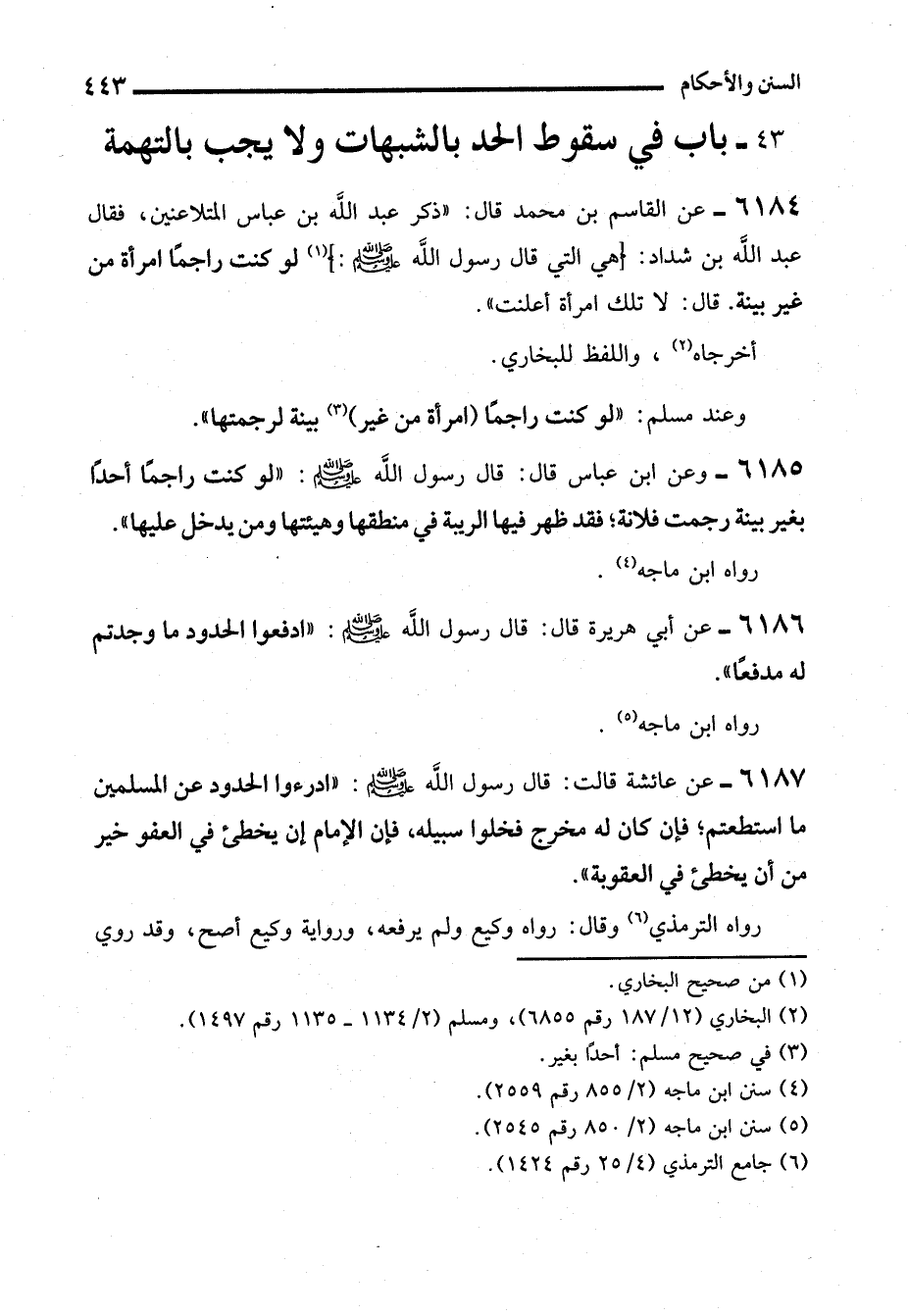 6186 - عن أبي هريرة قال: قال رسول الله - صلى الله عليه وسلم -: "ادفعوا الحدود ما وجدتم له مدفعًا".