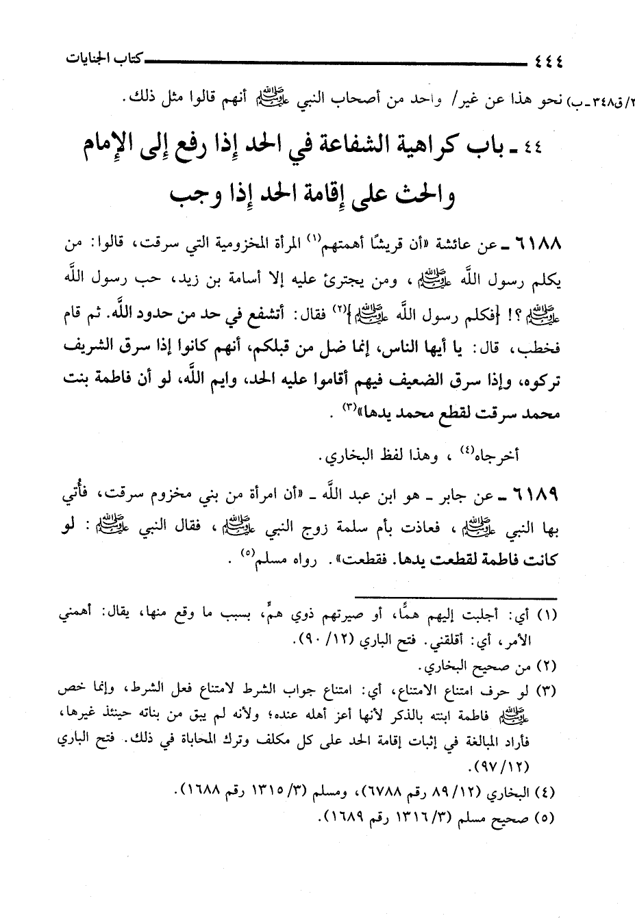 6189 - عن جابر -هو ابن عبد الله- "أن امرأة من بني مخزوم سرقت، فأُتي بها النبي - صلى الله عليه وسلم -، فعاذت بأم سلمة زوج النبي - صلى الله عليه وسلم -، فقال النبي - صلى الله عليه وسلم -: لو كانت فاطمة لقطعت يدها. فقطعت". رواه مسلم (¬5).