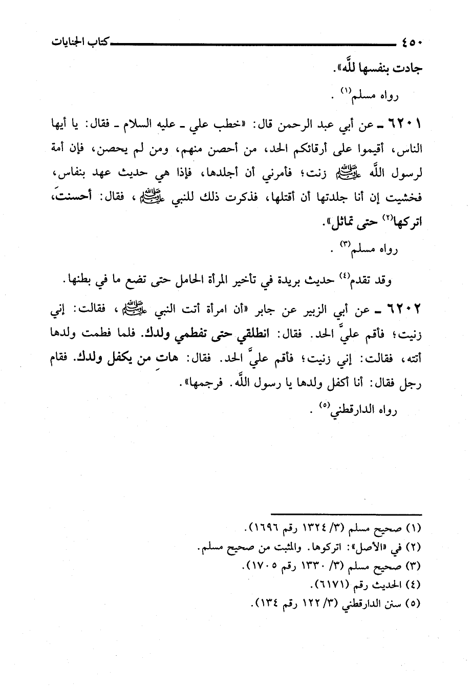 6201 - عن أبي عبد الرحمن قال: "خطب علي -رضي الله عنه- فقال: يا أيها الناس، أقيموا على أرقائكم الحد، من أحصن منهم، ومن لم يحصن، فإن أمة لرسول الله - صلى الله عليه وسلم - زنت؛ فأمرني أن أجلدها، فإذا هي حديث عهد بنفاس، فخشيت إن أنا جلدتها أن أقتلها، فذكرت ذلك للنبي - صلى الله عليه وسلم -، فقال: أحسنتَ، اتركها (¬2) حتى تماثل".
