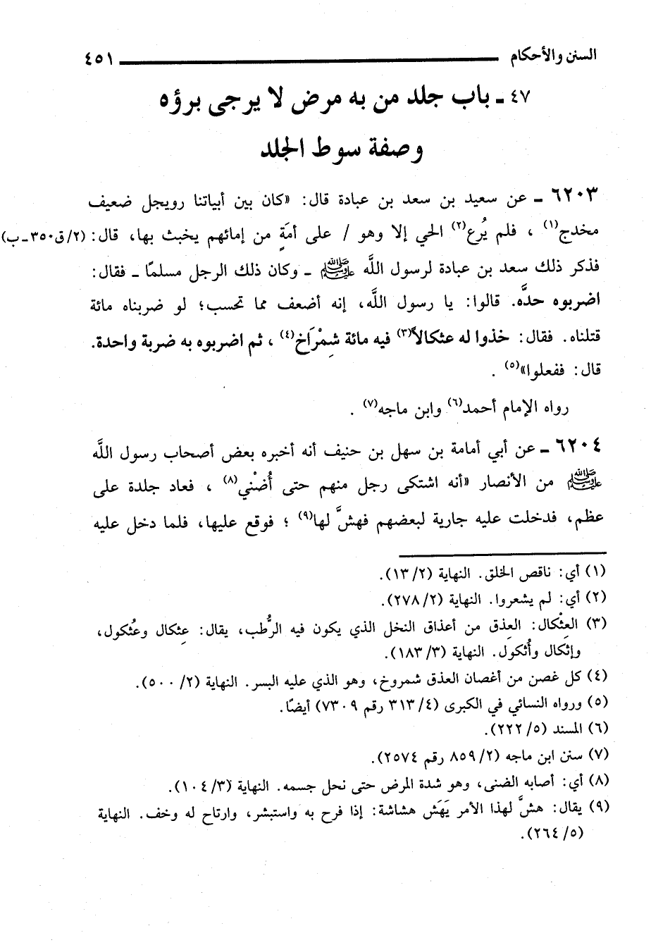6203 - عن سعيد بن سعد بن عبادة قال: "كان بين أبياتنا رويجل ضعيف مخدج (¬1)، فلم يُرع (¬2) الحي إلا وهو على أمَةٍ من إمائهم يخبث بها، قال: فذكر ذلك سعد بن عبادة لرسول الله صلى الله عليه وسلم -وكان ذلك الرجل مسلمًا- فقال: اضربوه حدَّه. قالوا: يا رسول الله، إنه أضعف مما تحسب؛ لو ضربناه مائة قتلناه. فقال: خذوا له عثكالًا (¬3) فيه مائة شِمْرَاخ (¬4)، ثم اضربوه به ضربة واحدة. قال: ففعلوا" (¬5).