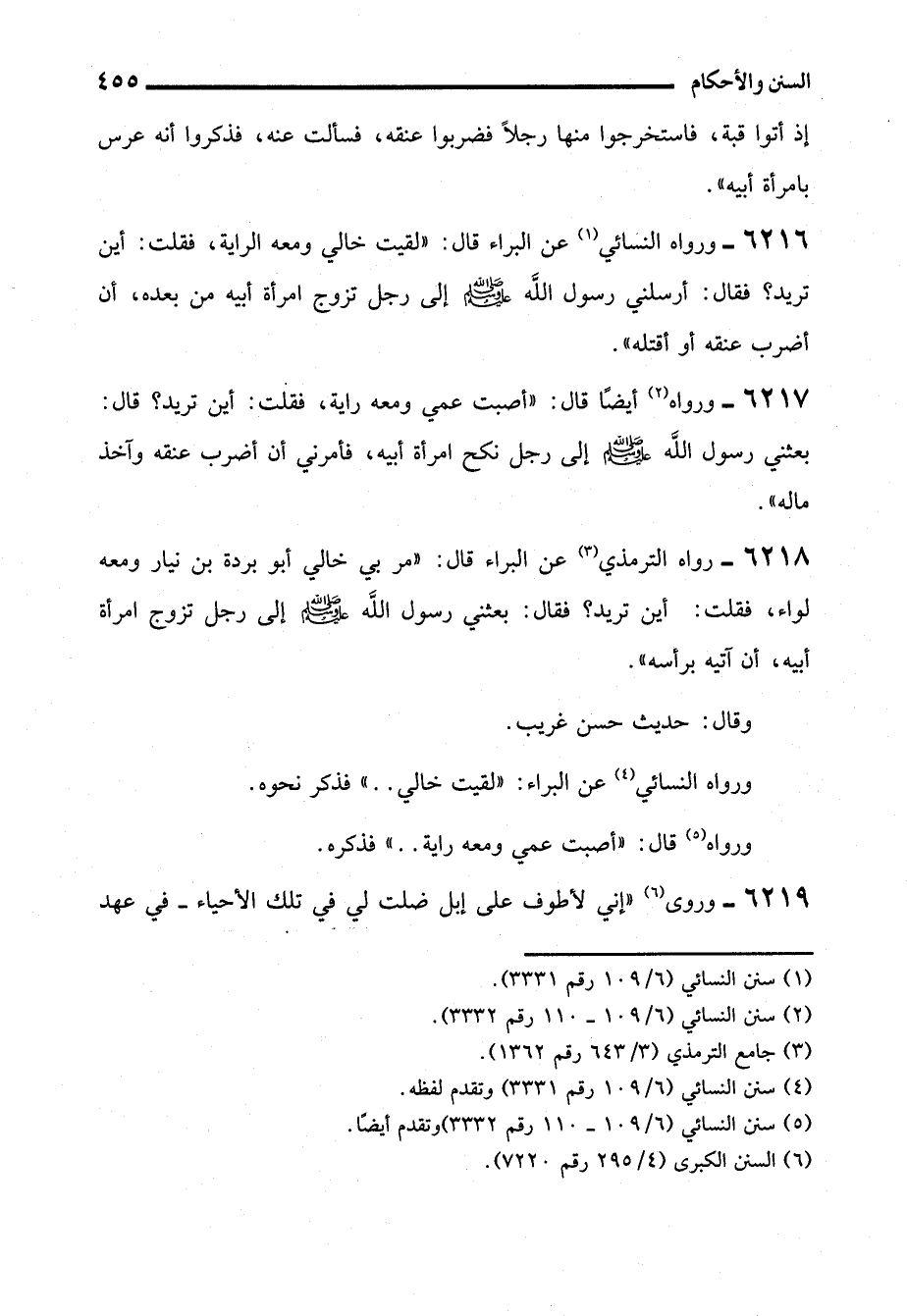 6216 - ورواه النسائي (¬1) عن البراء قال: "لقيت خالي ومعه الراية، فقلت: أين تريد؟ فقال: أرسلني رسول الله - صلى الله عليه وسلم - إلى رجل تزوج امرأة أبيه من بعده، أن أضرب عنقه أو أقتله".