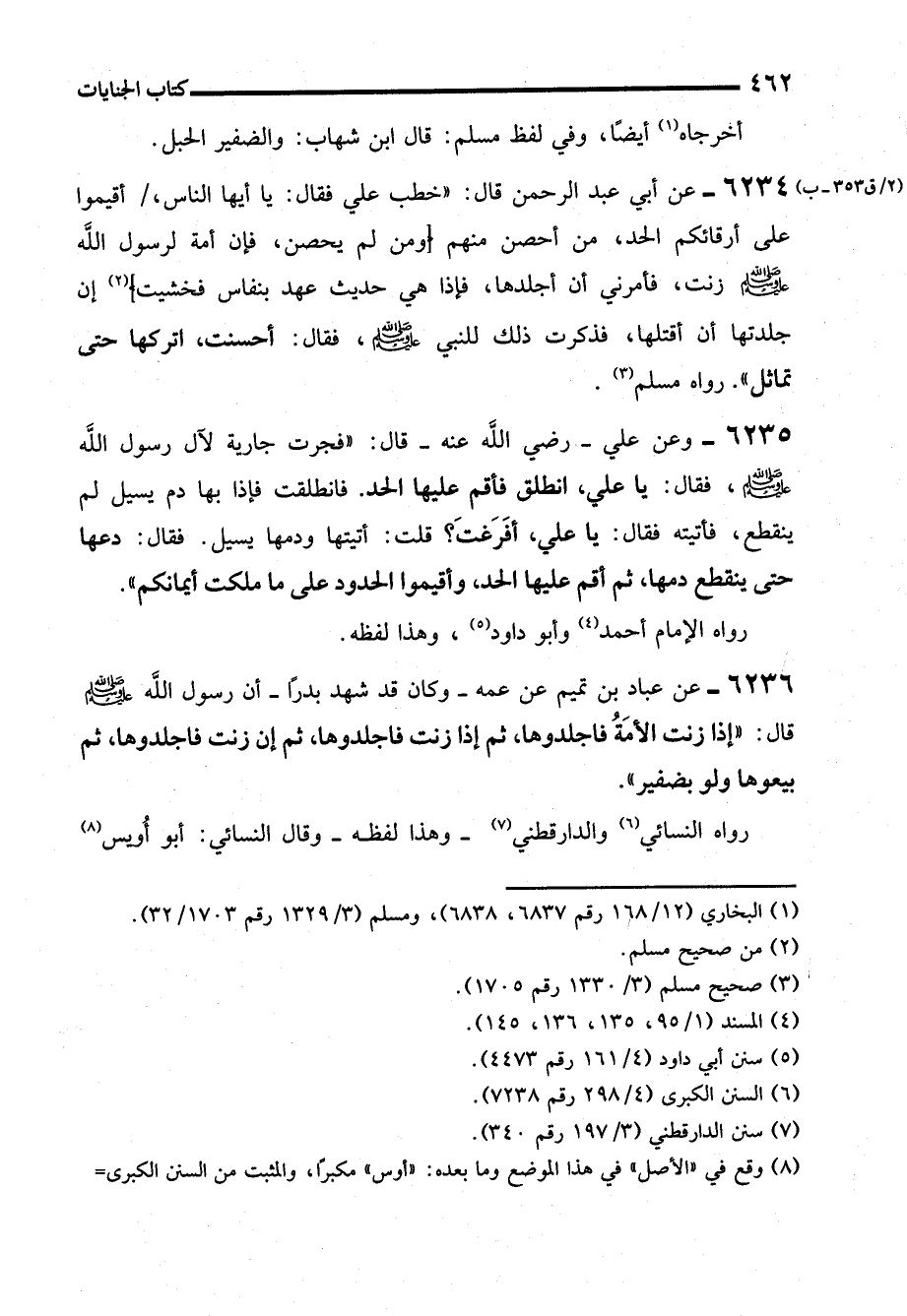6234 - عن أبي عبد الرحمن قال: "خطب علي فقال: يا أيها الناس، أقيموا على أرقائكم الحد، من أحصن منهم (ومن لم يحصن، فإن أمة لرسول الله - صلى الله عليه وسلم - زنت، فأمرني أن أجلدها، فإذا هي حديث عهد بنفاس فخشيت) (¬2) إن جلدتها أن أقتلها، فذكرت ذلك للنبي - صلى الله عليه وسلم -، فقال: أحسنت، اتركها حتى تماثل". رواه مسلم (¬3).
