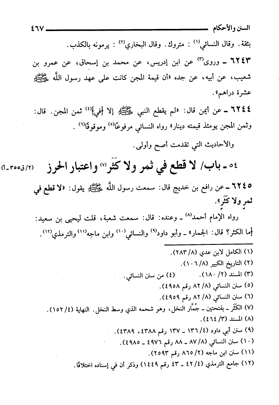 6243 - وروى (¬3) عن ابن إدريس، عن محمد بن إسحاق، عن عمرو بن شعيب، عن أبيه، عن جده "أن قيمة المجن كانت على عهد رسول الله - صلى الله عليه وسلم - عشرة دراهم".