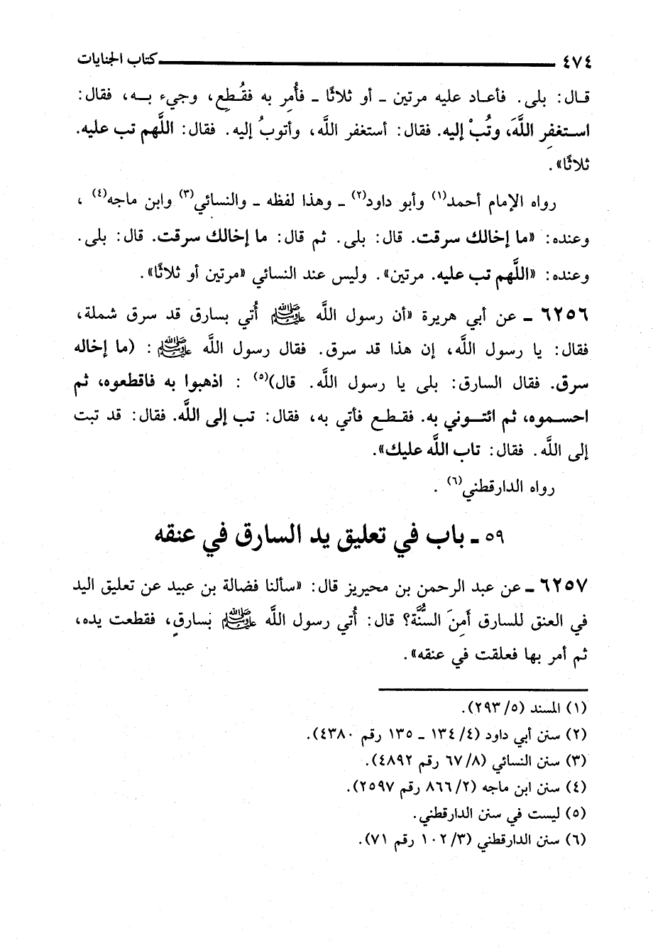 6257 - عن عبد الرحمن بن محيريز قال: "سألنا فضالة بن عبيد عن تعليق اليد في العنق للسارق أَمِنَ السُّنَّة؟ قال: أُتي رسول الله - صلى الله عليه وسلم - بسارقٍ، فقطعت يده، ثم أمر بها فعلقت في عنقه".