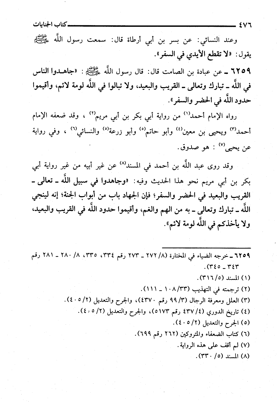 6259 - عن عبادة بن الصامت قال: قال رسول الله - صلى الله عليه وسلم -: "جاهدوا الناس في الله -تبارك وتعالى- القريب والبعيد، ولا تبالوا في الله لومة لائم، وأقيموا حدود الله في الحضر والسفر".