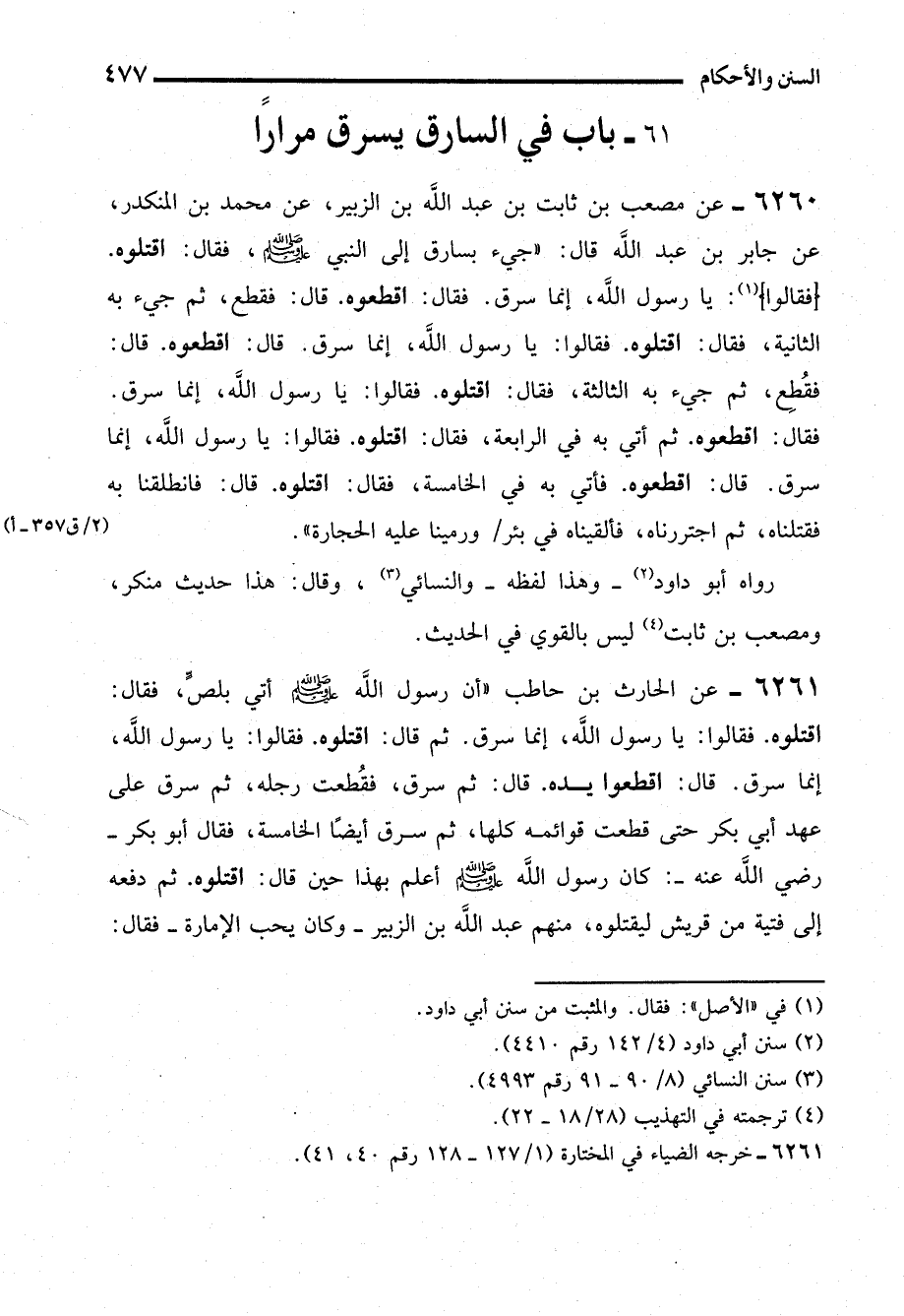 6261 - عن الحارث بن حاطب "أن رسول الله - صلى الله عليه وسلم - أتي بلصٍّ، فقال: اقتلوه. فقالوا: يا رسول الله، إنما سرق. ثم قال: اقتلوه. فقالوا: يا رسول الله، إنما سرق. قال: اقطعوا يده. قال: ثم سرق، فقُطعت رجله، ثم سرق على عهد أبي بكر حتى قطعت قوائمه كلها، ثم سرق أيضًا الخامسة، فقال أبو بكر -رضي الله عنه-: كان رسول الله - صلى الله عليه وسلم - أعلم بهذا حين قال: اقتلوه. ثم دفعه إلى فتية من قريش ليقتلوه، منهم عبد الله بن الزبير -وكان يحب الإمارة- فقال: