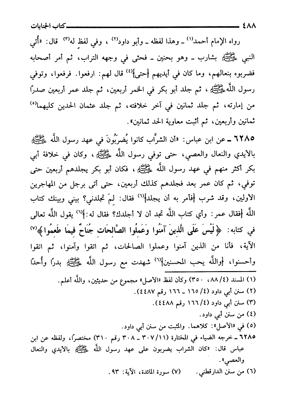 6285 - عن ابن عباس: "أن الشرَّاب كانوا يُضرَبُونَ في عهد رسول الله - صلى الله عليه وسلم - بالأيدي والنعال والعصي، حتى توفي رسول الله - صلى الله عليه وسلم -، وكان في خلافة أبي بكر أكثر منهم في عهد رسول الله - صلى الله عليه وسلم -، فكان أبو بكر يجلدهم أربعين حتى توفي، ثم كان عمر بعد فجلدهم كذلك أربعين، حتى أتى برجل من المهاجرين الأولين، وقد شرب (فأمر به أن يجلد) (¬6) فقال: لِمَ تجلدني؟ بيني وبينك كتاب الله (فقال عمر: وأي كتاب الله تجد أن لا أجلدك؟ فقال له:) (6) يقول الله تعالى في كتابه: {لَيْسَ عَلَى الَّذِينَ آمَنُوا وَعَمِلُوا الصَّالِحَاتِ جُنَاحٌ فِيمَا طَعِمُوا} (¬7) الآية، فأنا من الذين آمنوا وعملوا الصالحات، ثم اتقوا وآمنوا، ثم اتقوا وأحسنوا، (والله يحب المحسنين) (6) شهدت مع رسول الله - صلى الله عليه وسلم - بدرًا وأُحدًا