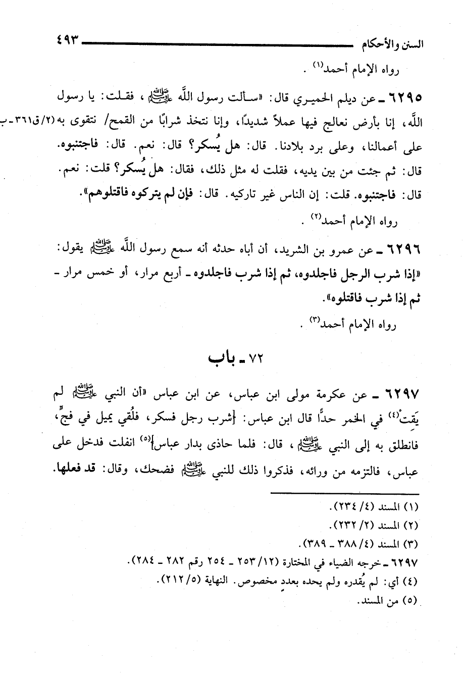 6295 - عن ديلم الحميري قال: "سألت رسول الله - صلى الله عليه وسلم -، فقلت: يا رسول الله، إنا بأرض نعالج فيها عملاً شديدًا، وإنا نتخذ شرابًا من القمح نتقوى به على أعمالنا، وعلى برد بلادنا. قال: هل يُسكر؟ قال: نعم. قال: فاجتنبوه. قال: ثم جئت من بين يديه، فقلت له مثل ذلك، فقال: هل يُسكر؟ قلت: نعم. قال: فاجتنبوه. قلت: إن الناس غير تاركيه. قال: فإن لم يتركوه فاقتلوهم".