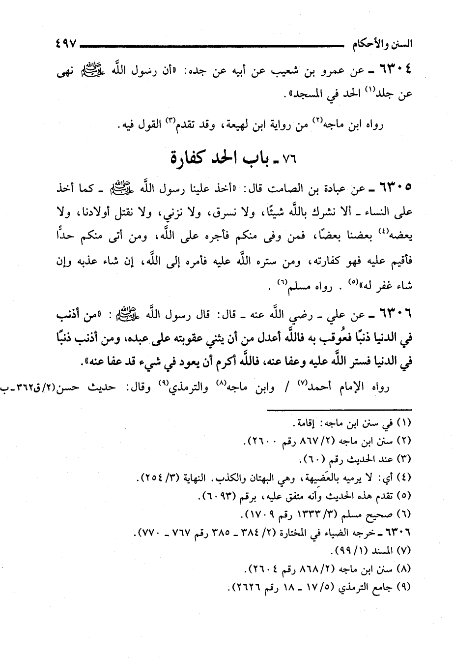 6304 - عن عمرو بن شعيب عن أبيه عن جده: "أن رسول الله - صلى الله عليه وسلم - نهى عن جلد (¬1) الحد في المسجد".