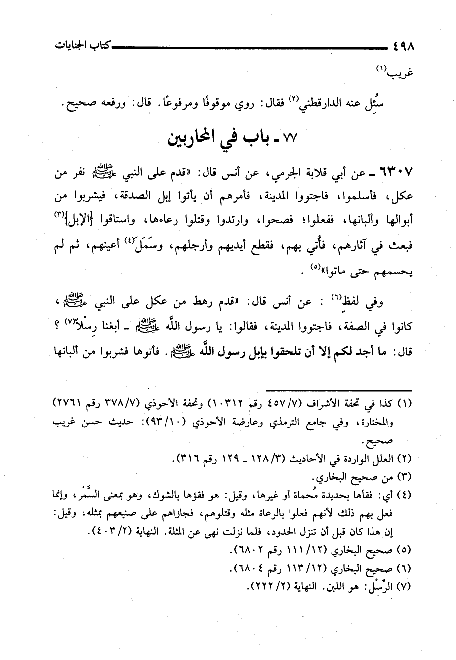 6307 - عن أبي قلابة الجرمي، عن أنس قال: "قدم على النبي - صلى الله عليه وسلم - نفر من عكل، فأسلموا، فاجتووا المدينة، فأمرهم أن يأتوا إبل الصدقة، فيشربوا من أبوالها وألبانها، ففعلوا؛ فصحوا، وارتدوا وقتلوا رعاءها، واستاقوا (الإبل) (¬3) فبعث في آثارهم، فأُتي بهم، فقطع أيديهم وأرجلهم، وسَمَلَ (¬4) أعينهم، ثم لم يحسمهم حتى ماتوا" (¬5).