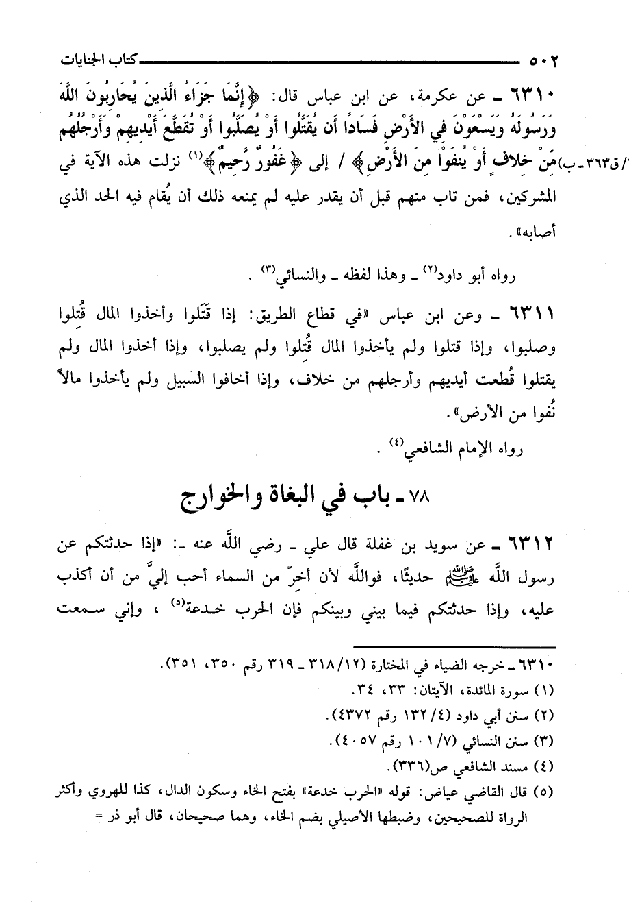 6311 - وعن ابن عباس "في قطاع الطريق: إذا قَتَلوا وأخذوا المال قُتِلوا وصلبوا، وإذا قتلوا ولم يأخذوا المال قُتِلوا ولم يصلبوا، إذا أخذوا المال ولم يقتلوا قُطعت أيديهم وأرجلهم من خلاف، إذا أخافوا السبيل ولم يأخذوا مالاً نُفوا من الأرض".