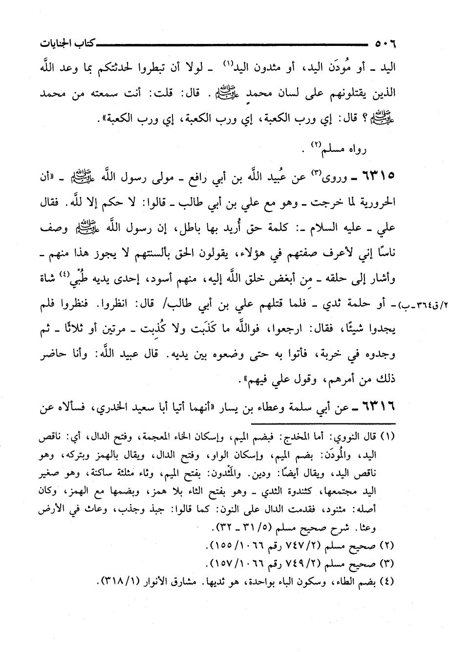 6315 - وروى (¬3) عن عُبيد الله بن أبي رافع -مولى رسول الله صلى الله عليه وسلم- "أن الحرورية لما خرجت -وهو مع علي بن أبي طالب- قالوا: لا حكم إلا للَّه. فقال علي -رضي الله عنه-: كلمة حق أُريد بها باطل، إن رسول الله - صلى الله عليه وسلم - وصف ناسًا إني لأعرف صفتهم في هؤلاء، يقولون الحق بألسنتهم لا يجوز هذا منهم -وأشار إلى حلقه- مِن أبغض خلق الله إليه، منهم أسود، إحدى يديه طُبْي (¬4) شاة -أو حلمة ثدي- فلما قتلهم علي بن أبي طالب قال: انظروا. فنظروا فلم يجدوا شيئًا، فقال: ارجعوا، فواللَّه ما كَذَبت ولا كُذِبت -مرتين أو ثلاثًا- ثم وجدوه في خربة، فأتوا به حتى وضعوه بين يديه. قال عبيد الله: وأنا حاضر ذلك من أمرهم، وقول علي فيهم".