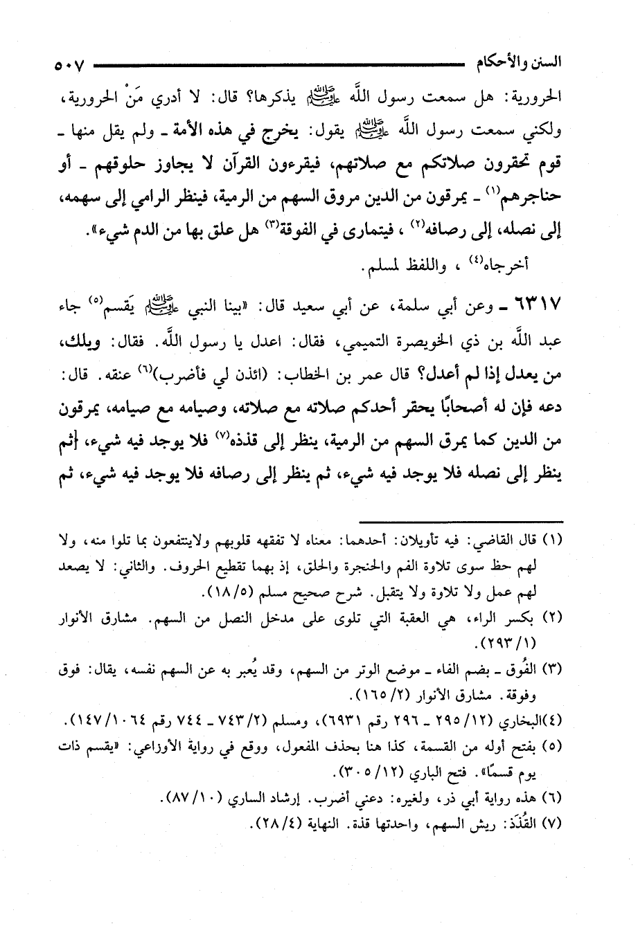 6317 - وعن أبي سلمة، عن أبي سعيد قال: "بينا النبي - صلى الله عليه وسلم - يَقسم (¬5) جاء عبد الله بن ذي الخويصرة التميمي، فقال: اعدل يا رسول الله. فقال: ويلك، من يعدل إذا لم أعدل؟ قال عمر بن الخطاب: (ائذن لي فأضرب) (¬6) عنقه. قال: دعه فإن له أصحابًا يحقر أحدكم صلاته مع صلاته، وصيامه مع صيامه، يمرقون من الدين كما يمرق السهم من الرمية، ينظر إلى قذذه (¬7) فلا يوجد فيه شيء، (ثم ينظر إلى نصله فلا يوجد فيه شيء، ثم ينظر إلى رصافه فلا يوجد فيه شيء، ثم
