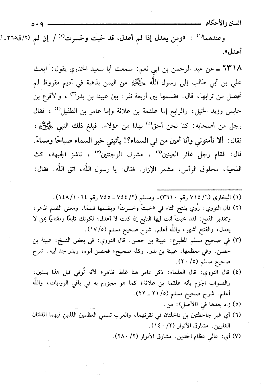 6318 - عن عبد الرحمن بن أبي نعم: سمعت أبا سعيد الخدري يقول: "بعث علي بن أبي طالب إلى رسول الله - صلى الله عليه وسلم - من اليمن بذهبة في أديم مقروظ لم تحصل من ترابها، قال: فقسمها بين أربعة نفر: بين عيينة بن بدر (¬3)، والأقرع بن حابس وزيد الخيل، والرابع إما علقمة بن علاثة وإما عامر بن الطفيل (¬4)، فقال رجل من أصحابه: كنا نحن أحق (¬5) بهذا من هؤلاء. فبلغ ذلك النبي - صلى الله عليه وسلم -، فقال: ألا تأمنوني وأنا أمين من في السماء؟! يأتيني خبر السماء صباحًا ومساءً. قال: فقام رجل غائر العينين (¬6)، مشرف الوجنتين (¬7)، ناشز الجبهة، كث اللحية، محلوق الرأس، مشمر الإزار. فقال: يا رسول الله، اتق الله. فقال: