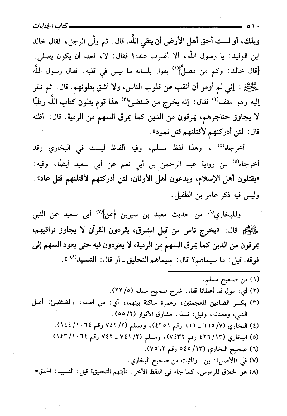 ويلك، أو لست أحق أهل الأرض أن يتقي الله. قال: ثم ولَّى الرجل، فقال خالد ابن الوليد: يا رسول الله، ألا أضرب عنقه؟ فقال: لا، لعله أن يكون يصلي. (قال خالد: وكم من مصلٍّ) (¬1) يقول بلسانه ما ليس في قلبه. فقال رسول الله - صلى الله عليه وسلم -: إني لم أومر أن أنقب عن قلوب الناس، ولا أشق بطونهم. قال: ثم نظر إليه وهو مقف (¬2) فقال: إنه يخرج من ضئضئ (¬3) هذا قوم يتلون كتاب الله رطبًا لا يجاوز حناجرهم، يمرقون من الدين كما يمرق السهم من الرمية. قال: أظنه قال: لئن أدركتهم لأقتلنهم قتل ثمود".