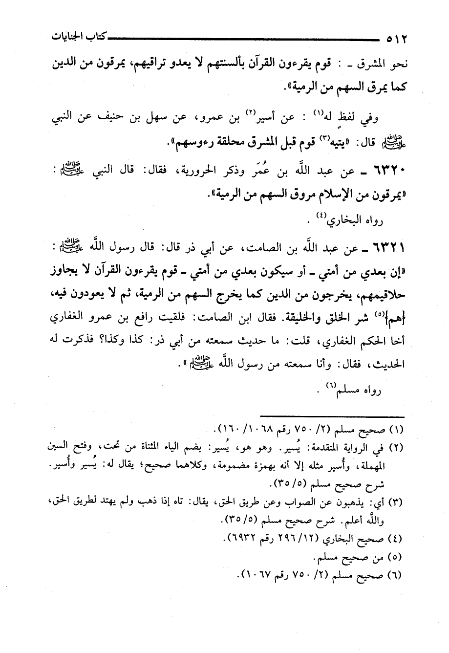 6320 - عن عبد الله بن عُمَر وذكر الحرورية، فقال: قال النبي - صلى الله عليه وسلم -: "يمرقون من الإسلام مروق السهم من الرمية".