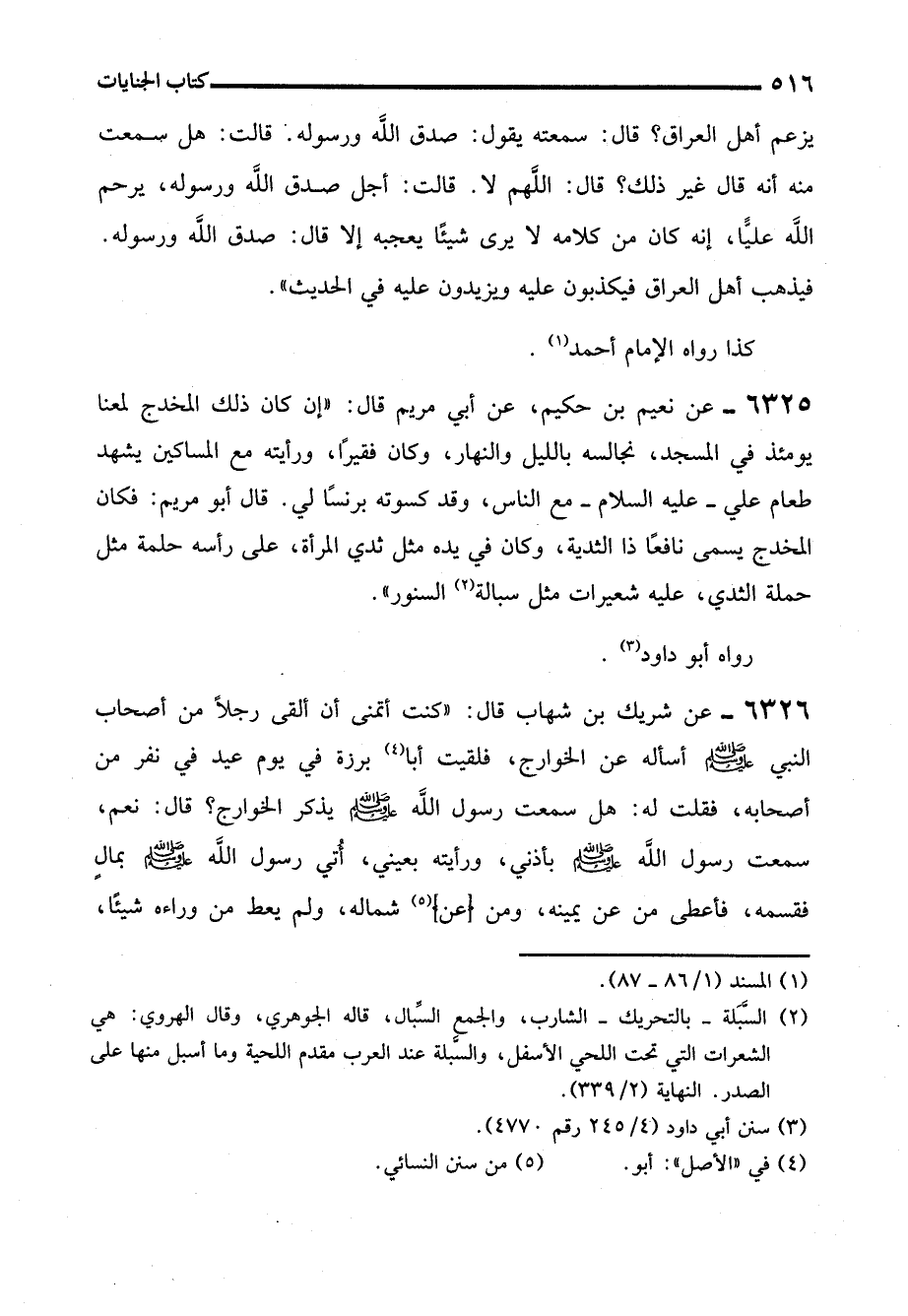 6325 - عن نعيم بن حكيم، عن أبي مريم قال: "إن كان ذلك المخدج لمعنا يومئذ في المسجد، نجالسه بالليل والنهار، وكان فقيرًا، ورأيته مع المساكين يشهد طعام علي -رضي الله عنه- مع الناس، وقد كسوته برنسًا لي. قال أبو مريم: فكان المخدج يسمى نافعًا ذا الثدية، وكان في يده مثل ثدي المرأة، على رأسه حلمة مثل حملة الثدي، عليه شعيرات مثل سبالة (¬2) السنور".