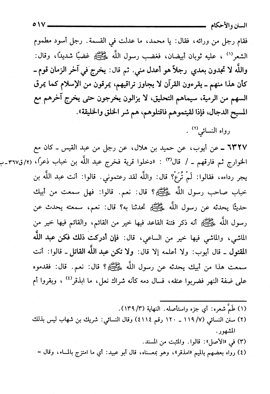 6327 - عن أيوب، عن حميد بن هلال، عن رجل من عبد القيس -كان مع الخوارج ثم فارقهم- قال (¬3): "دخلوا قرية فخرج عبد الله بن خباب ذعرًا، يجر رداءه، فقالوا: لَمْ تُرَعْ؟ قال: واللَّه لقد رعتموني. قالوا: أنت عبد الله بن خباب صاحب رسول الله - صلى الله عليه وسلم -؟ قال: نعم. قالوا: فهل سمعت من أبيك حديثًا يحدثه عن رسول الله - صلى الله عليه وسلم - تحدثنا به؟ قال: نعم، سمعته يحدث عن رسول الله - صلى الله عليه وسلم - أنه ذكر فتنة القاعد فيها خير من القائم، والقائم فيها خير من الماشي، والماشي فيها خير من الساعي، قال: فإن أدركت ذلك فكن عبد الله المقتول -قال أيوب: ولا أعلمه إلا قال: ولا تكن عبد الله القاتل- قالوا: أنت سمعت هذا من أبيك يحدثه عن رسول الله - صلى الله عليه وسلم -؟ قال: نعم. قال: فقدموه على ضفة النهر فضربوا عنقه، فسأل دمه كأنه شراك نعل، ما ابذقر (¬4)، وبقروا أم