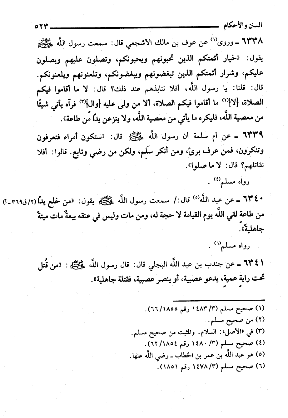 6338 - وروى (¬1) عن عوف بن مالك الأشجعي قال: سمعت رسول الله - صلى الله عليه وسلم - يقول: "خيار أئمتكم الذين تحبونهم ويحبونكم، وتصلون عليهم ويصلون عليكم، وشرار أئمتكم الذين تبغضونهم ويبغضونكم، وتلعنونهم ويلعنونكم. قال: قلنا: يا رسول الله، أفلا ننابذهم عند ذلك؟ قال: لا ما أقاموا فيكم الصلاة، (لا) (¬2) ما أقاموا فيكم الصلاة، ألا من ولى عليه (والٍ) (¬3) فرآه يأتي شيئاً من معصية الله، فليكره ما يأتي من معصية الله، ولا ينزعن يداً من طاعة".