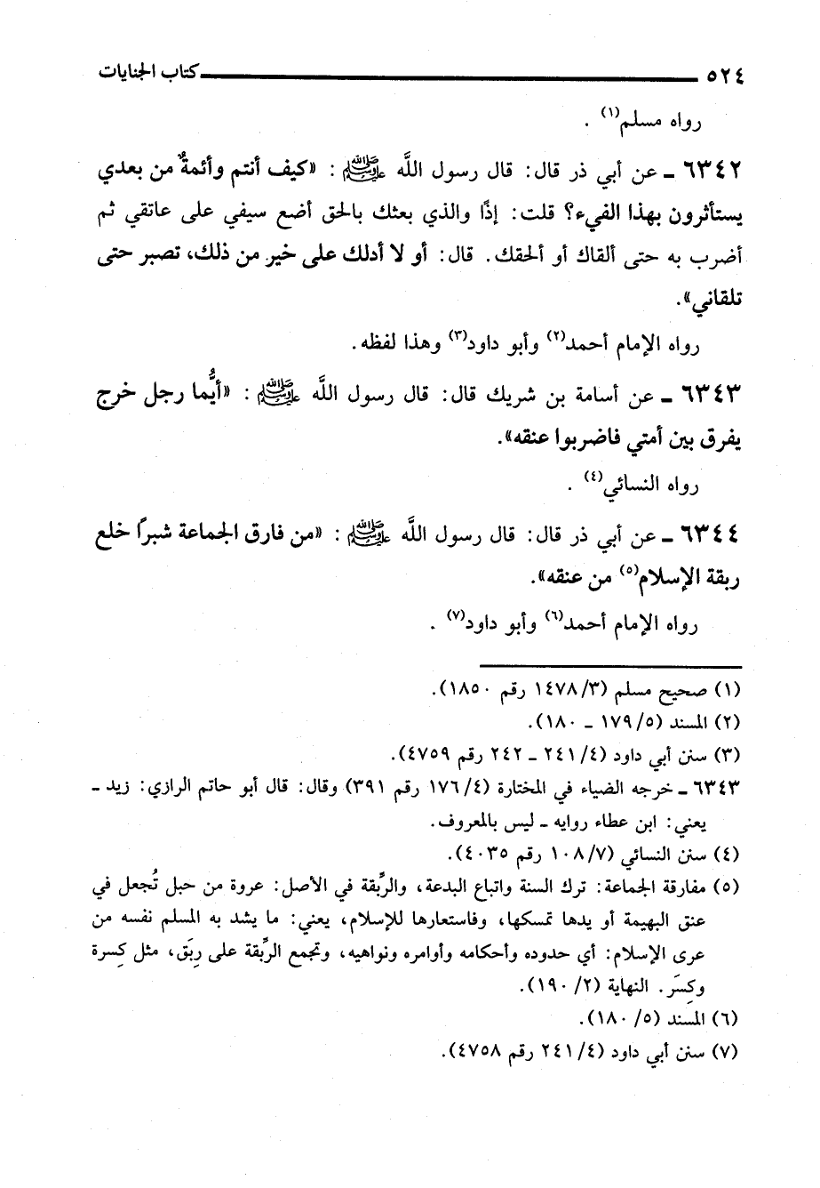 6344 - عن أبي ذر قال: قال رسول الله - صلى الله عليه وسلم -: "من فارق الجماعة شبرًا خلع ربقة الإسلام (¬5) من عنقه".