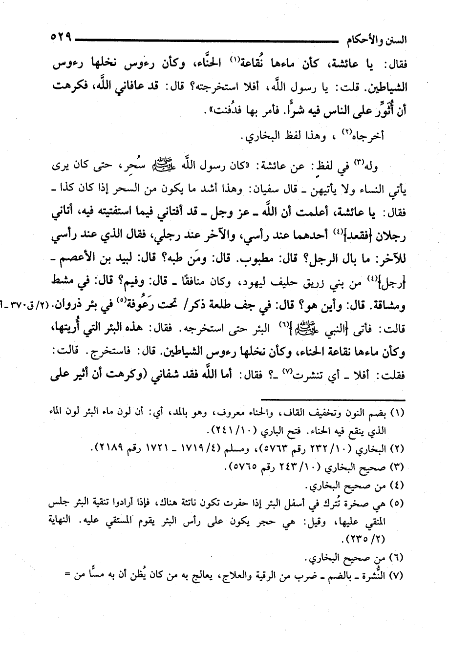 وله (¬3) في لفظٍ: عن عائشة: "كان رسول الله - صلى الله عليه وسلم - سُحِر، حتى كان يرى يأتي النساء ولا يأتيهن -قال سفيان: وهذا أشد ما يكون من السحر إذا كان كذا- فقال: يا عائشة، أعلمت أن الله -عز وجل- قد أفتاني فيما استفتيته فيه، أتاني رجلان (فقعد) (¬4) أحدهما عند رأسي، والآخر عند رجلي، فقال الذي عند رأسي للآخر: ما بال الرجل؟ قال: مطبوب. قال: ومَن طبه؟ قال: لبيد بن الأعصم - (رجل) (4) من بني زريق حليف ليهود، وكان منافقًا- قال: وفيم؟ قال: في مشط ومشاقة. قال: وأين هو؟ قال: في جف طلعة ذكر تحت رَعُوفة (¬5) في بئر ذروان. قالت: فأتى (النبي - صلى الله عليه وسلم -) (¬6) البئر حتى استخرجه. فقال: هذا البئر التي أُريتها، وكأن ماءها نقاعة الحناء، وكأن نخلها رءوس الشياطين. قال: فاستخرج. قالت: فقلت: أفلا -أي تنشرت (¬7) -؟ فقال: أما الله فقد شفاني (وكرهت أن أثير على