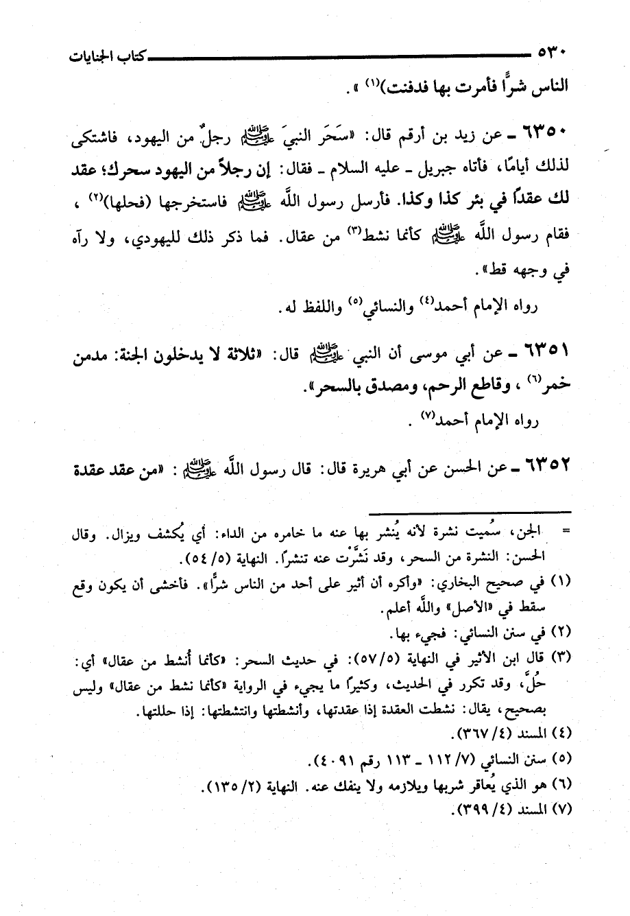 6350 - عن زيد بن أرقم قال: "سَحَر النبيَّ - صلى الله عليه وسلم - رجلٌ من اليهود، فاشتكى لذلك أيامًا، فأتاه جبريل -رضي الله عنه- فقال: إن رجلاً من اليهود سحرك؛ عقد لك عقدًا في بئر كذا وكذا. فأرسل رسول الله - صلى الله عليه وسلم - فاستخرجها (فحلها) (¬2)، فقام رسول الله - صلى الله عليه وسلم - كأنما نشط (¬3) من عقال. فما ذكر ذلك لليهودي، ولا رآه في وجهه قط".