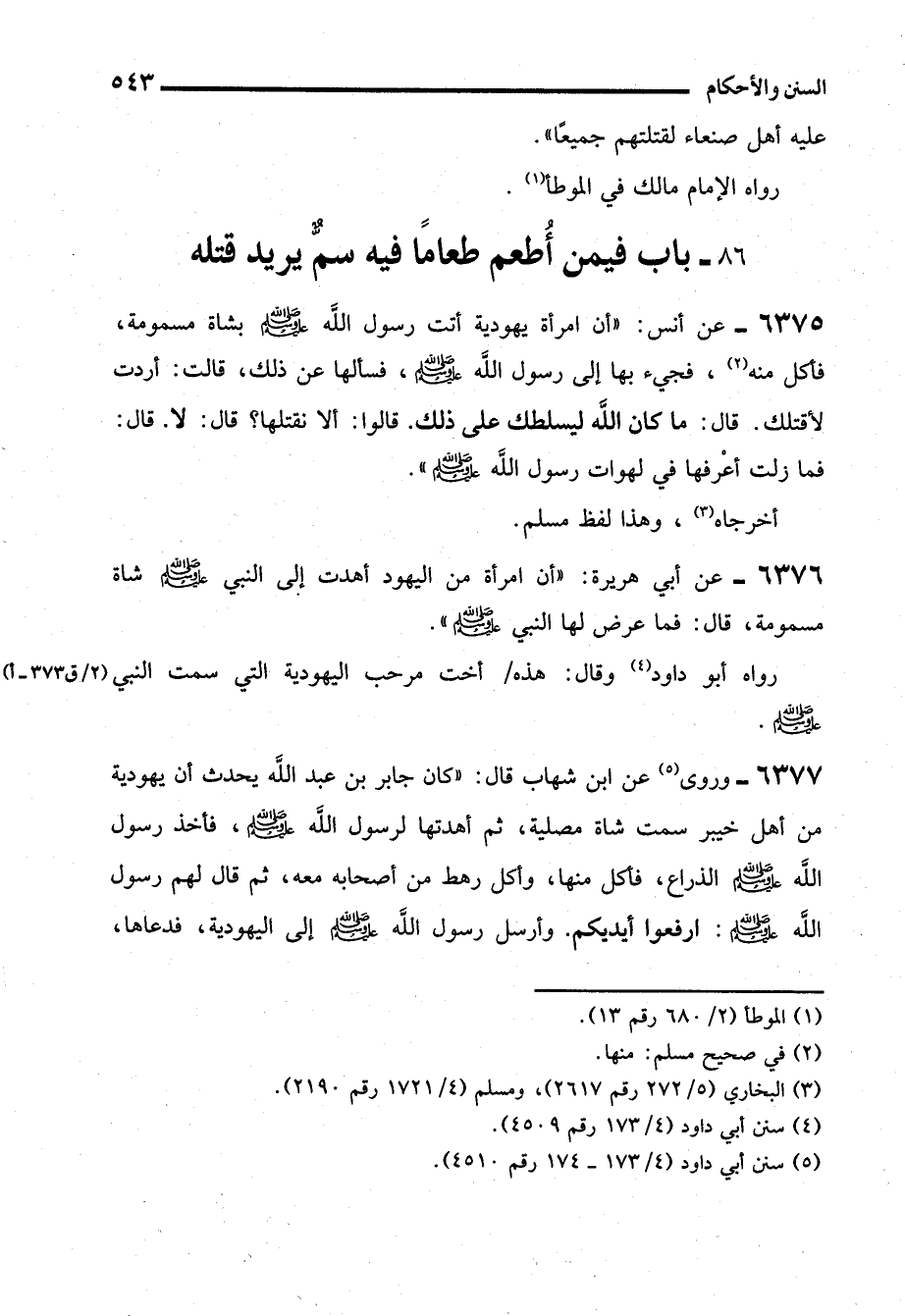 6377 - وروى (¬5) عن ابن شهاب قال: "كان جابر بن عبد الله يحدث أن يهودية من أهل خيبر سمت شاة مصلية، ثم أهدتها لرسول الله - صلى الله عليه وسلم -، فأخذ رسول الله - صلى الله عليه وسلم - الذراع، فأكل منها، وأكل رهط من أصحابه معه، ثم قال لهم رسول الله - صلى الله عليه وسلم -: ارفعوا أيديكم. وأرسل رسول الله - صلى الله عليه وسلم - إلى اليهودية، فدعاها،