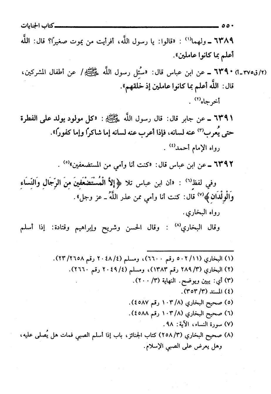 6390 - عن ابن عباس قال: "سُئِل رسول الله - صلى الله عليه وسلم - عن أطفال المشركين، قال: الله أعلم بما كانوا عاملين إذ خلقهم".