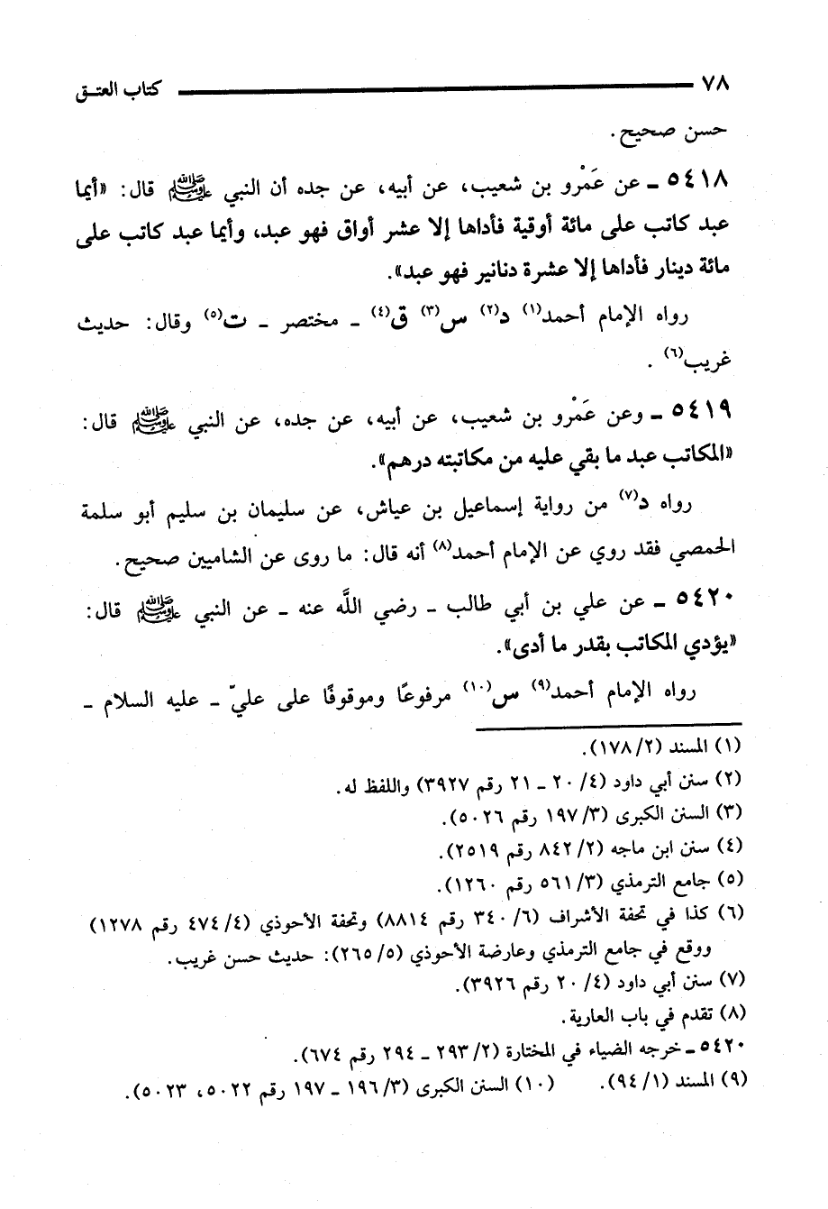 5418 - عن عَمْرو بن شعيب، عن أبيه، عن جده أن النبي - صلى الله عليه وسلم - قال: "أيما عبد كاتب على مائة أوقية فأداها إلا عشر أواق فهو عبد، وأيما عبد كاتب على مائة دينار فأداها إلا عشرة دنانير فهو عبد".