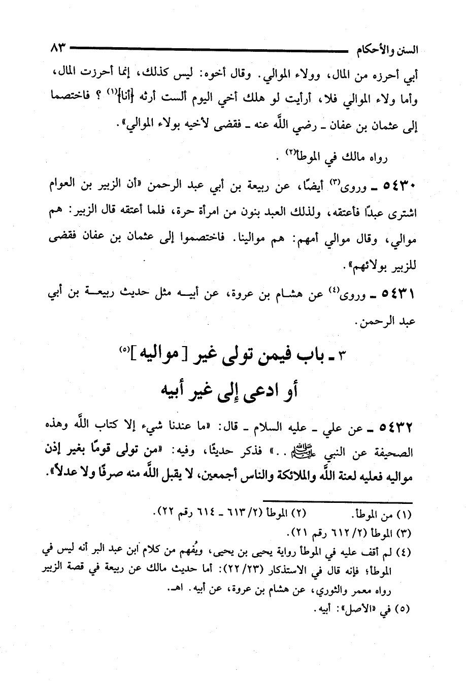 5430 - وروى (¬3) أيضًا، عن ربيعة بن أبي عبد الرحمن "أن الزبير بن العوام اشترى عبدًا فأعتقه، ولذلك العبد بنون من امرأة حرة، فلما أعتقه قال الزبير: هم موالي، وقال موالي أمهم: هم موالينا. فاختصموا إلى عثمان بن عفان فقضى للزبير بولائهم".