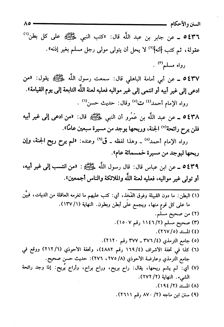 5439 - عن ابن عباس قال: قال رسول الله - صلى الله عليه وسلم -: "من انتسب إلى غير أبيه، أو تولى غير مواليه، فعليه لعنة الله والملائكة والناس أجمعين".