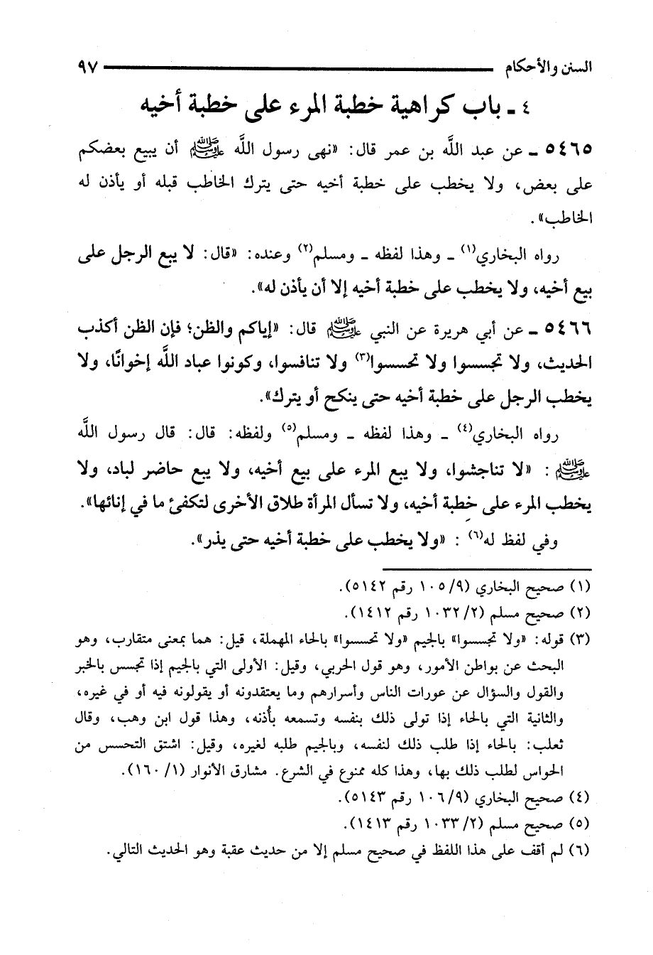 5466 - عن أبي هريرة عن النبي - صلى الله عليه وسلم - قال: "إياكم والظن؛ فإن الظن أكذب الحديث، ولا تجسسوا ولا تحسسوا (¬3) ولا تنافسوا، وكونوا عباد الله إخوانًا، ولا يخطب الرجل على خطبة أخيه حتى ينكح أو يترك".