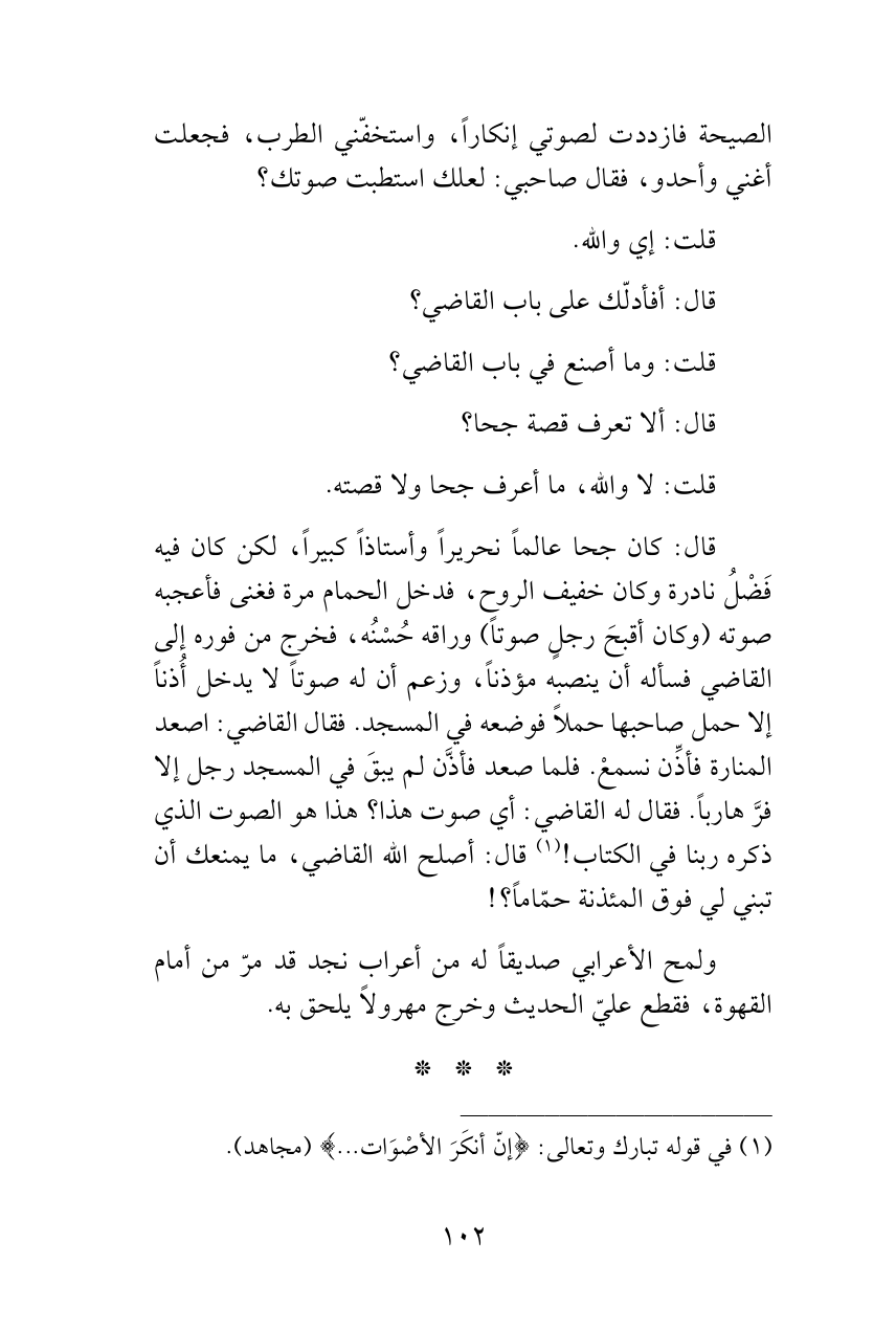قال: كان جحا عالماً نحريراً وأستاذاً كبيراً، لكن كان فيه فَضْلُ نادرة وكان خفيف الروح، فدخل الحمام مرة فغنى فأعجبه صوته (وكان أقبحَ رجلٍ صوتاً) وراقه حُسْنُه، فخرج من فوره إلى القاضي فسأله أن ينصبه مؤذناً، وزعم أن له صوتاً لا يدخل أُذناً إلا حمل صاحبها حملاً فوضعه في المسجد. فقال القاضي: اصعد المنارة فأذِّن نسمعْ. فلما صعد فأذَّن لم يبقَ في المسجد رجل إلا فرَّ هارباً. فقال له القاضي: أي صوت هذا؟ هذا هو الصوت الذي ذكره ربنا في الكتاب! (¬1) قال: أصلح الله القاضي، ما يمنعك أن تبني لي فوق المئذنة حمّاماً؟!